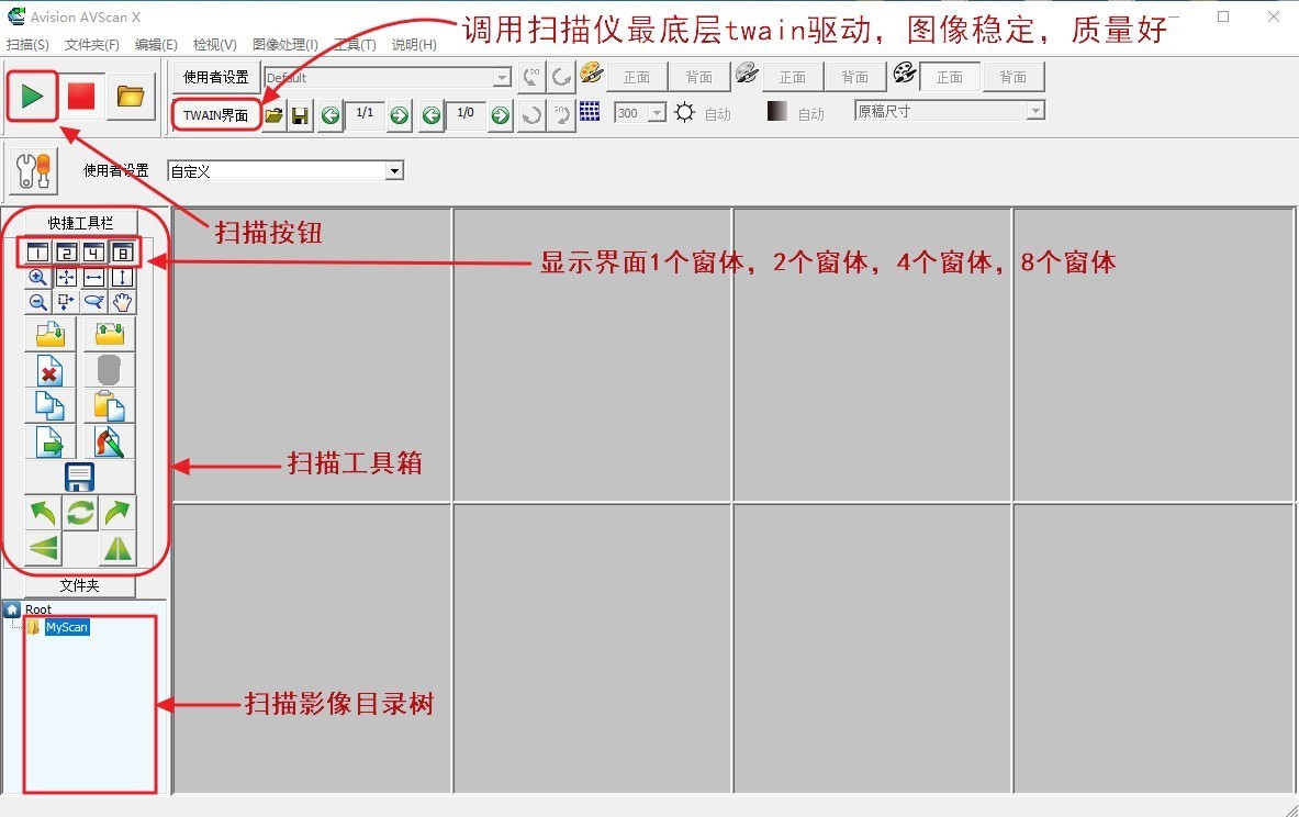 虹光随机携带的第三方扫描软件AVScanX免费使用,提供插入扫描,覆盖扫描,页码二次排序,图像自定义命名,界面如下图: