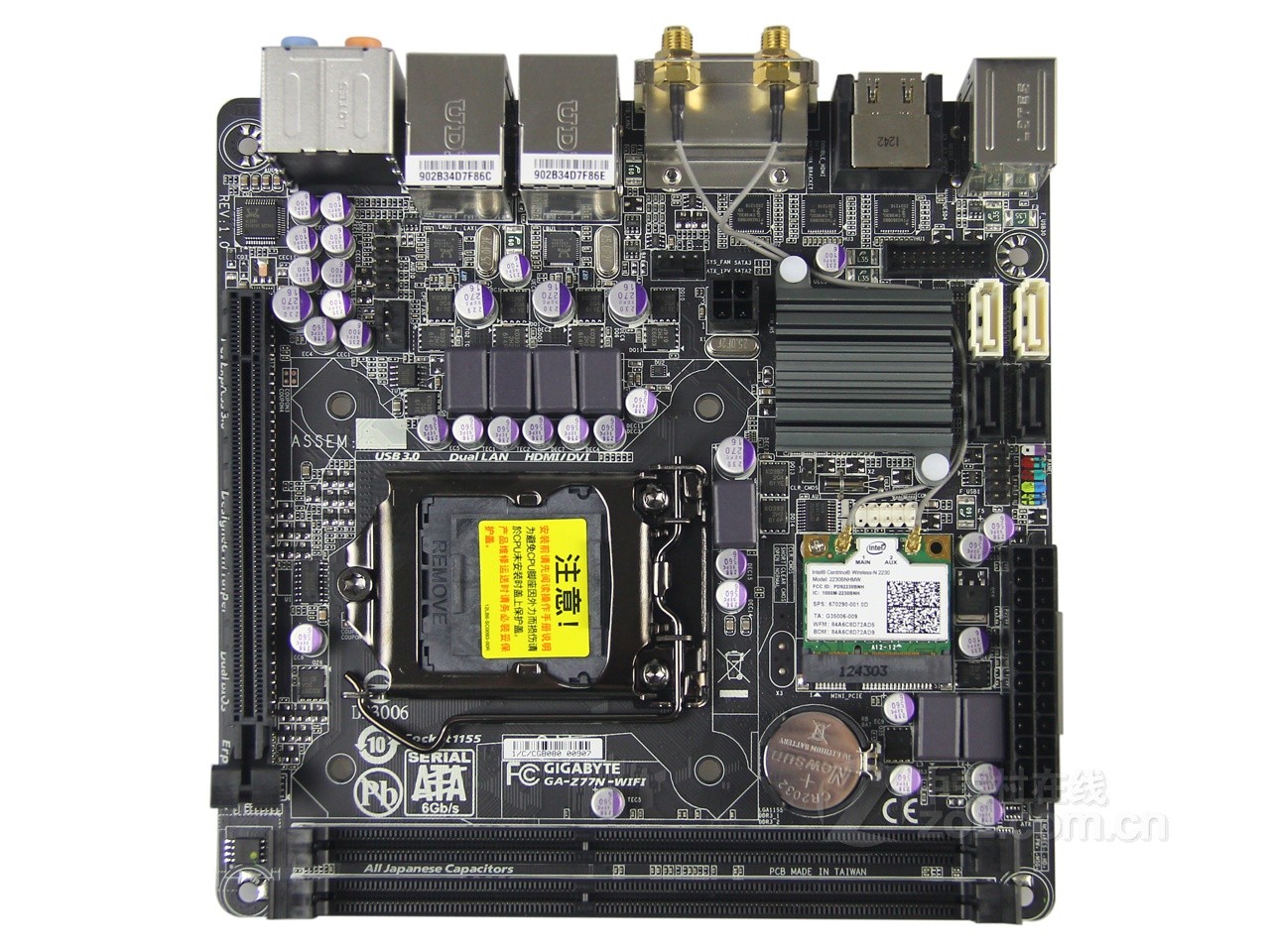 整体规格全面,造型布局十分规整的一块主板。技嘉在Intel 7系列的主板中,B75、H77、Z77均有ITX版型主板推出,这为用户提供了非常广泛的选择空间。不过Z77N WiFi并无太多创意,整体设计与B75N及H77N相雷同,稍显遗憾。但台系一线品质,一流质保,999元超低价格已经让该主板没有了不被选择的理由。在布局上,该主板的大部分接口及插针位置都非常合理,走线过程中没有遇到过多障碍。规格方面,身为Z77芯片组与,双网口双HDMI接口的它既可以满足超频用户的需求,又可以成为一台称职的家庭HTPC基板,可谓两全其美。