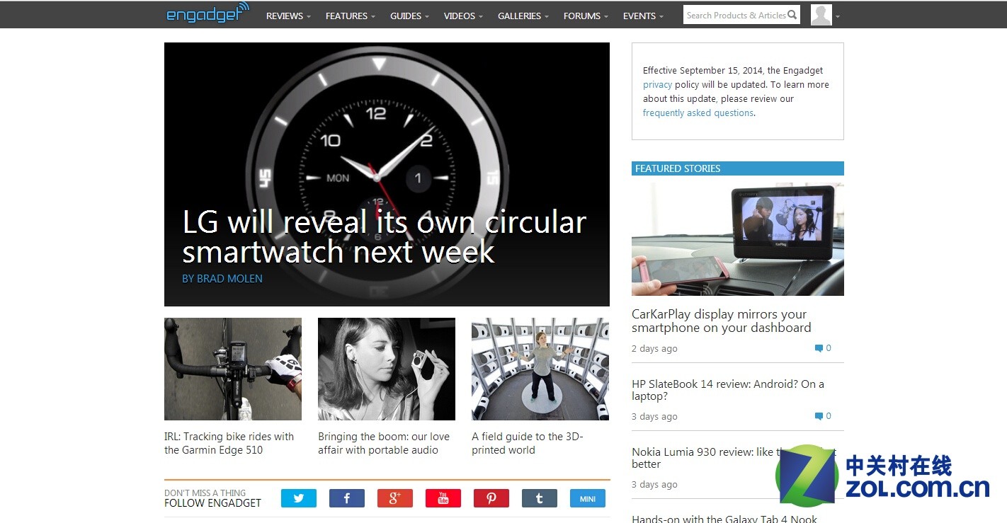 在评测文章方面,Engadget在产品的介绍和使用感觉上介绍的相当全面,并且在文章中会搭配测试的图片和实测的拍摄视频。最重要的文字介绍相当翔实,每一评测部分的文字力求精确,并且会有“读者提问”环节,挑选一些文章中没有说到的问题,作为整体文章的补充。以产品为主的评测视点,并不会夹杂一些产品之外的如厂商创始人等“花边”,这样一来能够让读者带着较少的个人倾向去看待产品。