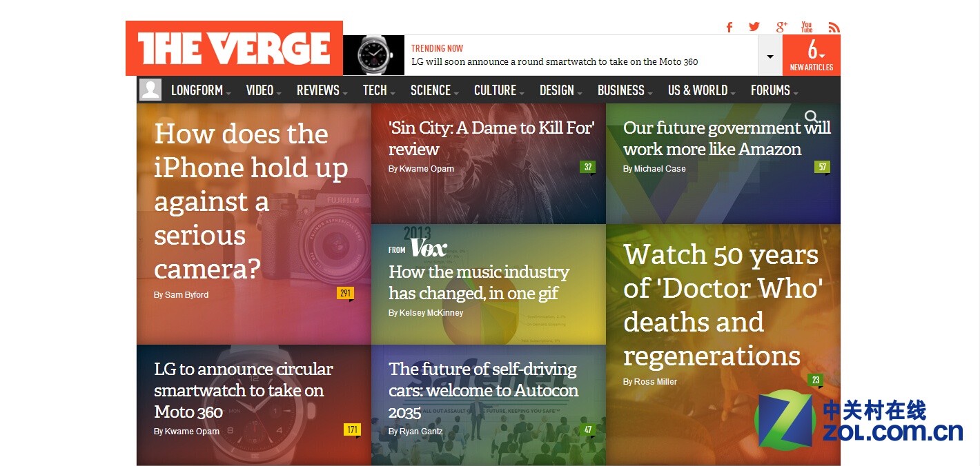 The Verge是一个脱胎于Engadget的科技媒体,在成立的短短两年时间内,就已经拿到了五项被誉为“互联网奥斯卡”的威比奖。当人们第一次点开The Verge的首页时,绝对会被其独特的网站设计所震撼,大块色块的使用,对文章种类进行区分。文章标题采用特殊设计的字体,让网友能够快速对其留下深刻的印象,并突出主题。
