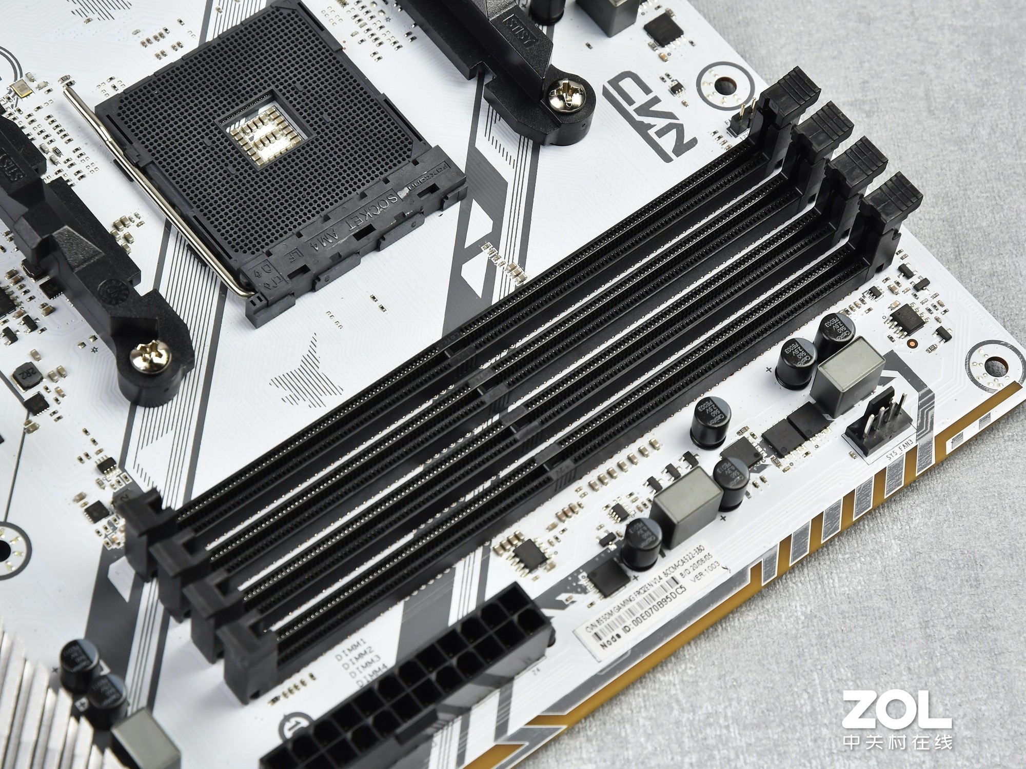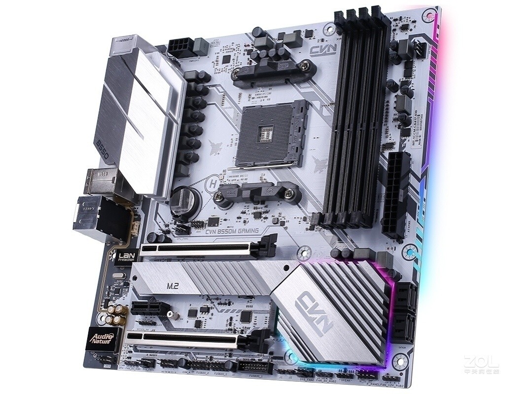显卡插槽方面,七彩虹CVN B550M GAMING FROZEN V14主板拥有两根PCIe x16长插槽,靠近CPU为X16模式支持PCIe 4.0技术,下面一根为X4模式,支持PCIe 3.0,两根插槽都装备了金属保护装甲,可以防止显卡插拔意外造成损坏。