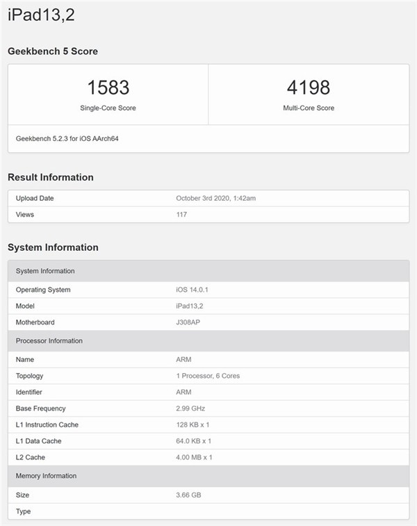 这两天据外媒最新报道称,苹果将会在本周五正式开卖iPad Air 4,其实这款新品之前就宣布了,而之所以拖到现在才开卖,主要是他们不想提前泄漏A14处理器的更多信息。虽然iPad Air 4还没有发售,但是A14性能已经有所体现,这款设备搭载的是6核心处理器,基本频率为2.99GHz,RAM容量为4GB。