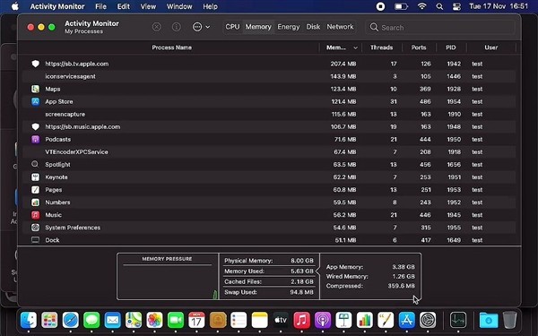 为了验证M1芯片在实际应用环境下的流畅度,尤其是在仅有8GB内存的支持下,是否足够流畅,对基础款M1 MacBook Air进行了测试,并通过Activity Monitor来查看内存利用率。