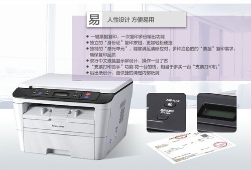 联想M7400 Pro还有独立的“身份证”复印按钮,更加轻松便捷地复印身份证;它具有“支票打印助手”功能,相当于多买了一台“支票打印机”,十分实惠。标配250页超大容量封闭纸盒,不用客户频繁更换。