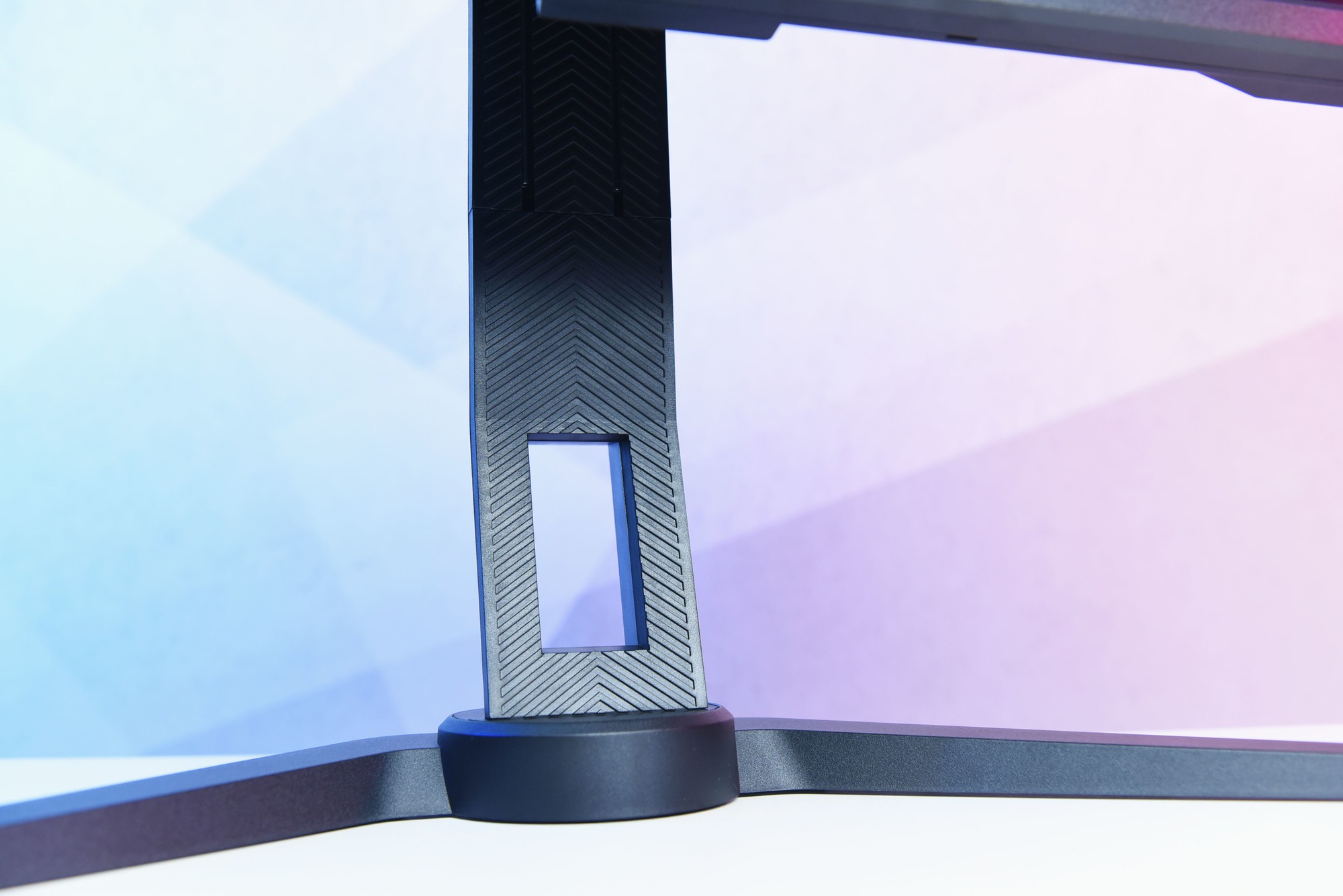 人字形底座大开大合,放在桌子上非常稳定。不必担心上方的34英寸大屏幕有任何闪失。 电缆收纳插槽的设计非常贴心,可以将杂乱的线材收拢一起,从而使桌面更加简洁。