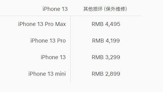 iPhone 13 mini 1699元 、iPhone 13 2149元、iPhone 13 Pro 2149元、iPhone 13 Pro Max 2559元,而如果用户购买了AppleCare+,价格仅为188元。