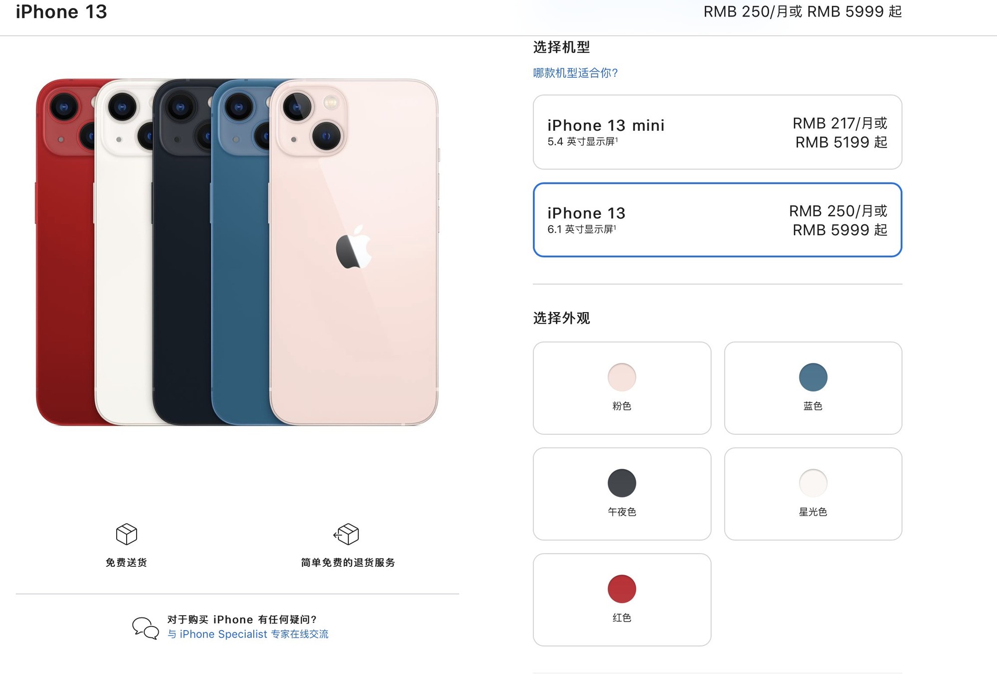 ·iPhone 13 mini 128GB:5199 元、256GB:5999 元、512GB:7599 元;