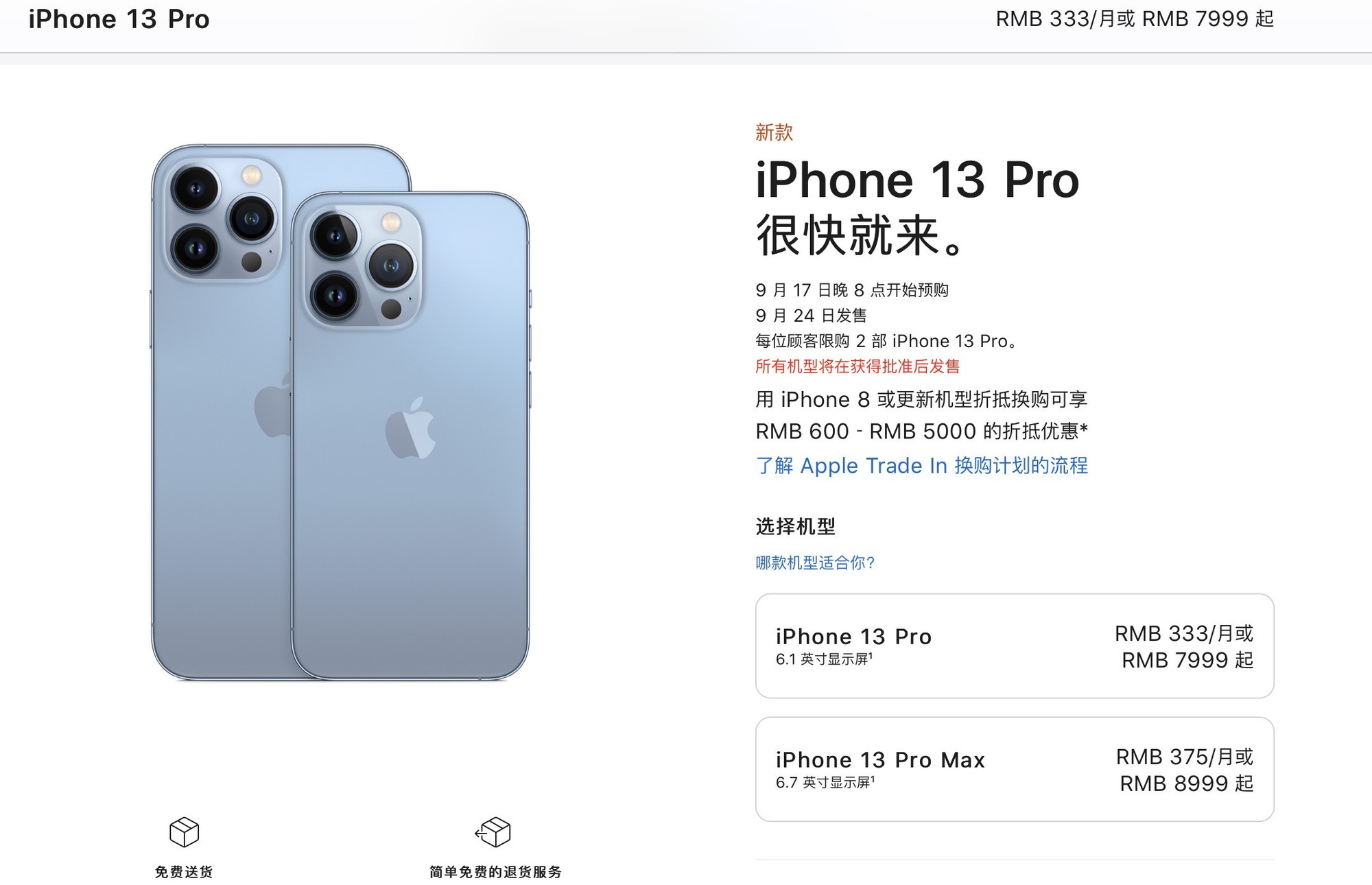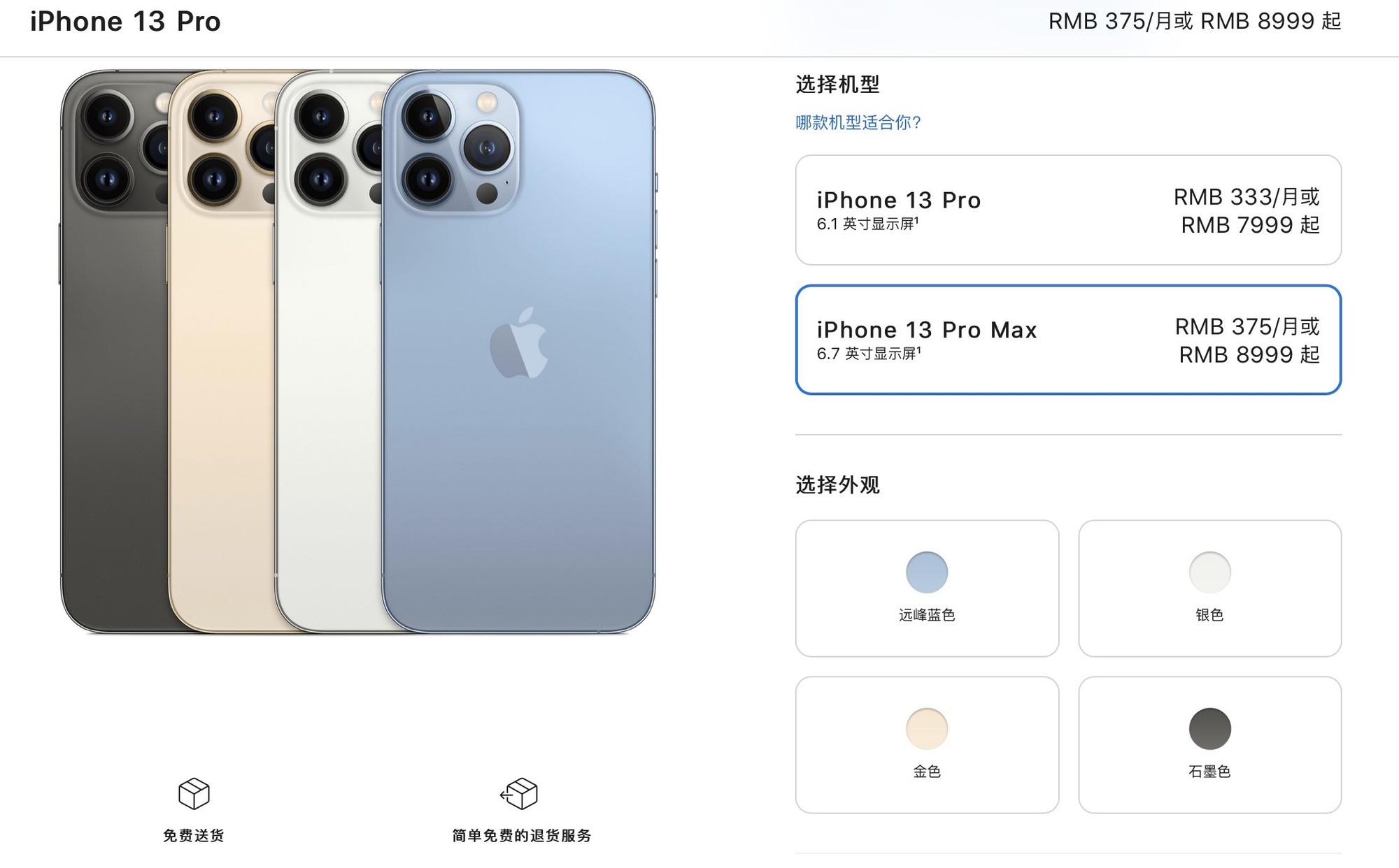 ·iPhone 13 Pro 128GB:7999 元、256GB:8799 元、512GB:10399 元、1TB:11999 元;