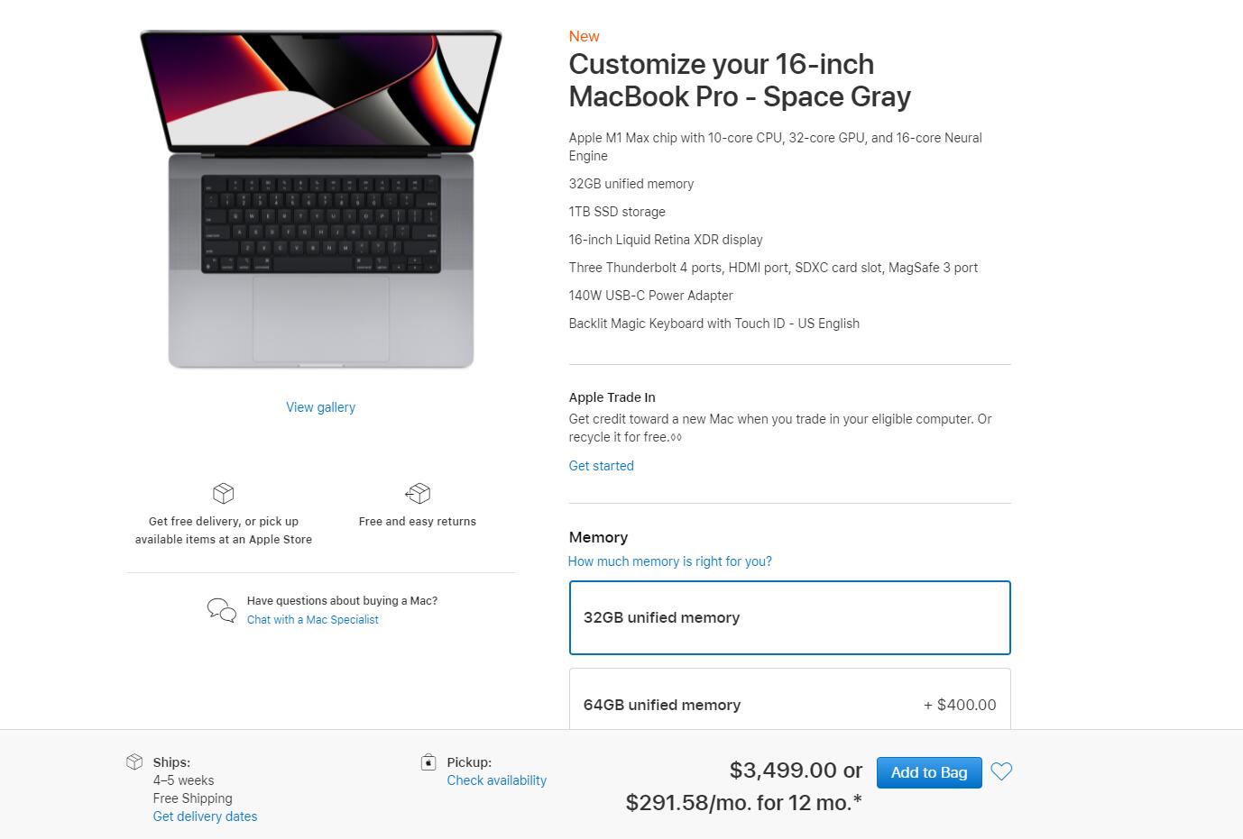 我们首先来看看美版的价格,14英寸基础版售价为1999美元,折合人民币12758元;14英寸基础满级版本的售价为6398.98美元,折合人民币40843元;16英寸基础版售价为3499美元,折合人民币22337元;16英寸顶配满级版售价为6598.98美元 ,折合人民币42129元。