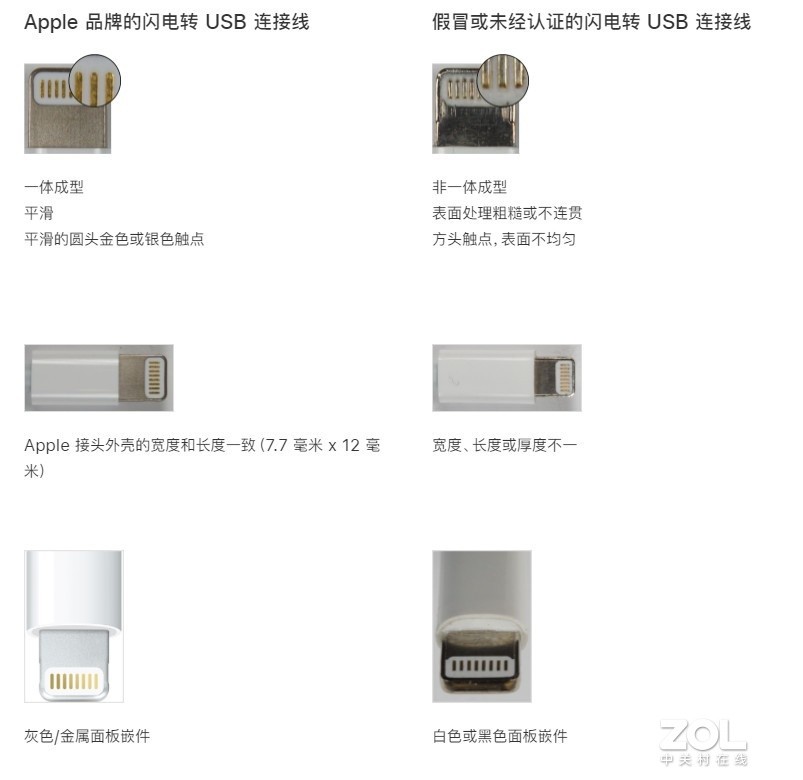 通过最终审核的MFi认证充电线,在其lightning接口的下方会多了一小块芯片,这颗芯片就是MFi认证芯片,而没有通过认证的数据线虽然短时间内能够充电和进行数据传输,但在使用一段时间之后,大概率会出现屏幕设备警告信息,并中断正在进行的充电行为。