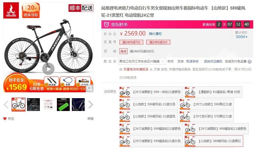 PHOENIX凤凰TDE101Z 电动助力车当前秒杀价2569元,参加满2499元减500元活动, 使用满2400减500券,到手价仅需1569元,性价比非常不错,让你出行更便利,喜欢的小伙伴儿可以买起来了。