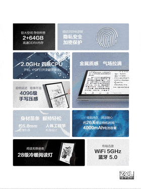 | 其他功能 | 指示灯:充电灯,充电时红色,充满电绿色 按键:开关机/指纹识别 图书格式:TXT/EPUB/PDF/UMD/MOBI/EBK2/EBK3/UMD/DJVUIAZW3/ZIP漫画 |