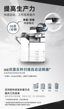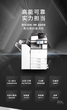 理光IM3000搭载RiNeo智慧操作平台,标配全新的10.1英寸智能操作面板,操作更流畅,拥有全新UI操作界面,并能提供与智能手机/平板电脑相同的智能化操作方式;预热时间17.7秒,首页输出时间为4.6秒(黑白),减少等待时间,输出速度高达每分钟30页,快速完成文印作业);标配复印、网络打印和网络彩色扫描功能;支持1200dpi×1200dpi打印分辨率;内置2GB+2GB SOP内存,并且标配320GB硬盘。支持多种印后处理选配件,印品稳定。