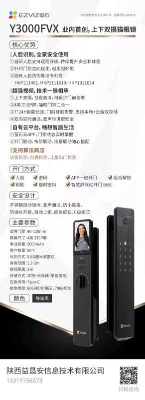 近日,萤石3D人脸识别双画面可视大屏远程解锁变声对讲儿童出门检测版指纹锁Y3000FVX在陕西萤石总代理“陕西益昌安防(来电价优)”处促销,来电价优安装服务,性能出色,品质服务,好物好价,感兴趣的朋友可以直接联系商家,[联系电话] 15319756573 13709201375 15319758267 029-85535573