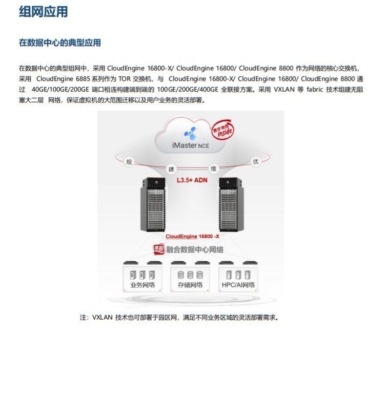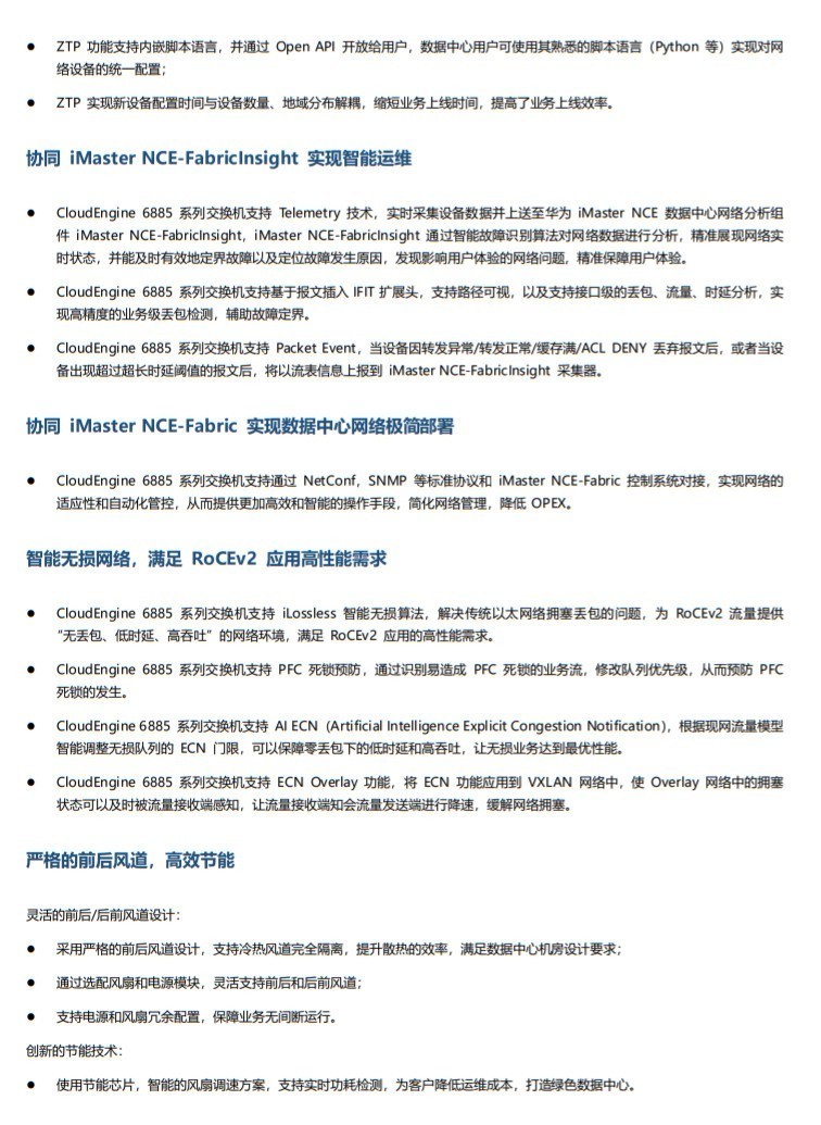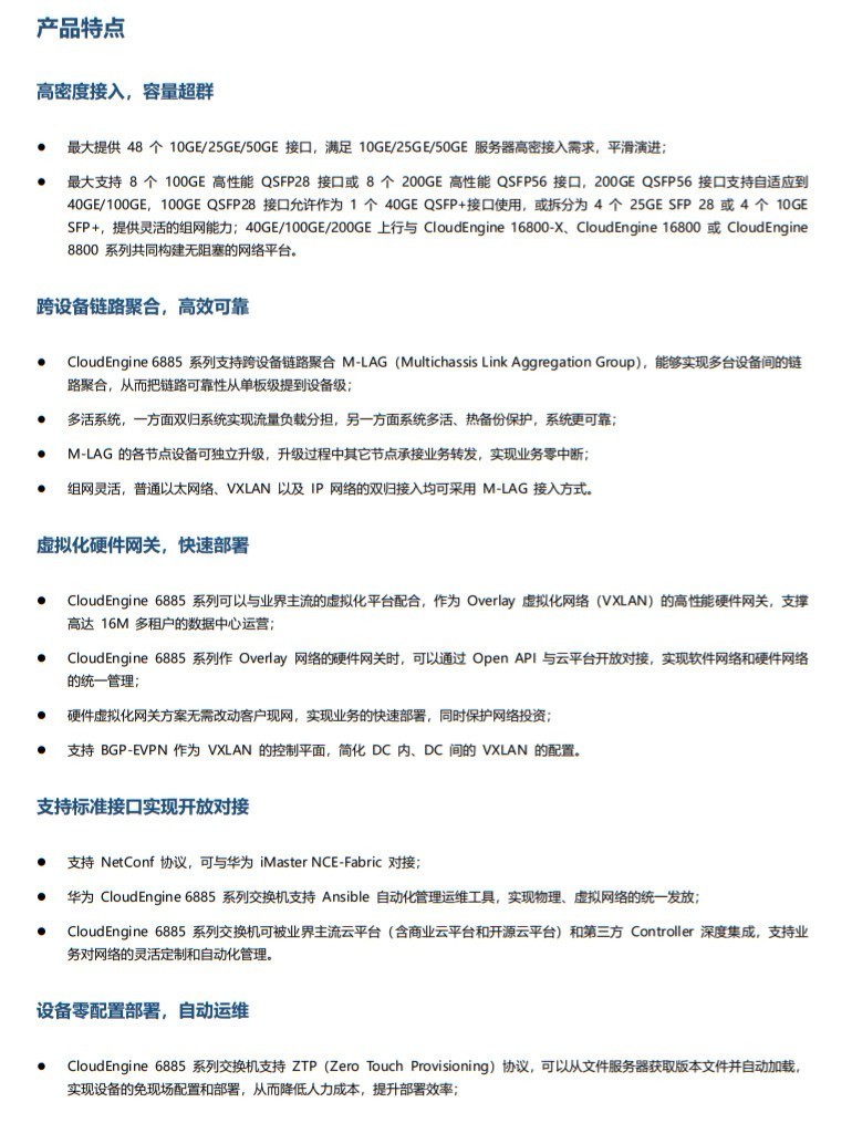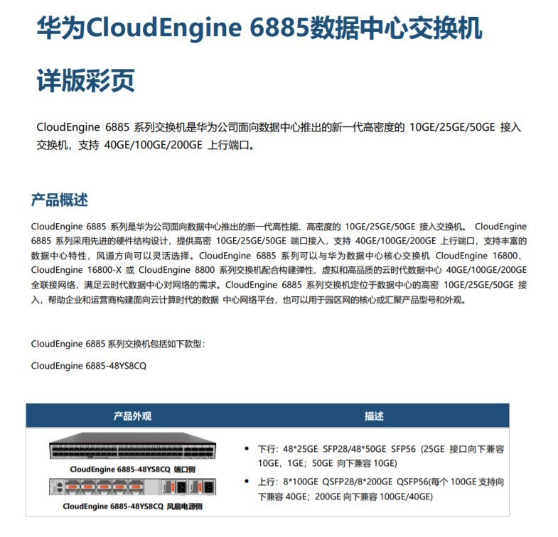 华为CloudEngine 6885 系列是华为公司面向数据中心推出的新一代高性能、高密度的 10GE/25GE/50GE 接入交换机。 CloudEngine 6885 系列采用先进的硬件结构设计, 提供高密 10GE/25GE/50GE 端口接入, 支持 40GE/100GE/200GE 上行端口, 支持丰富的数据中心特性,风道方向可以灵活选择。 CloudEngine 6885 系列可以与华为数据中心核心交换机 CloudEngine 16800、CloudEngine 16800-X 或 CloudEngine 8800 系列交换机配合构建弹性、虚拟和高品质的云时代数据中心 40GE/100GE/200GE 全联接网络,满足云时代数据中心对网络的需求。CloudEngine 6885 系列交换机定位于数据中心的高密 10GE/25GE/50GE 接入,帮助企业和运营商构建面向云计算时代的数据 中心网络平台, 也可以用于园区网的核心或汇聚产品型号和外观。
