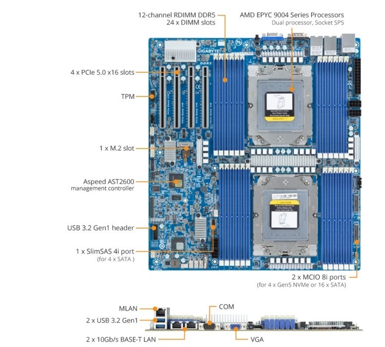 技嘉MZ73-LM0 产品总览为下一代服务器架构和能效提供动力 AMD的5纳米 "Zen 4 "架构是由多代成功的EPYC创新和芯片设计铺就的,AMD EPYC 9004系列处理器延续了这一进展。新的 EPYC 处理器系列增加了大量新功能,以满足各种工作负载的需求,将提供更好的 CPU 性能和每瓦性能,并在一个拥有 2 倍 PCIe 4.0 通道吞吐量的平台上实现这一目标。