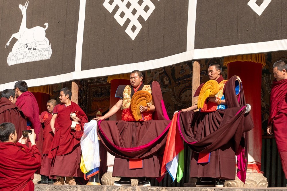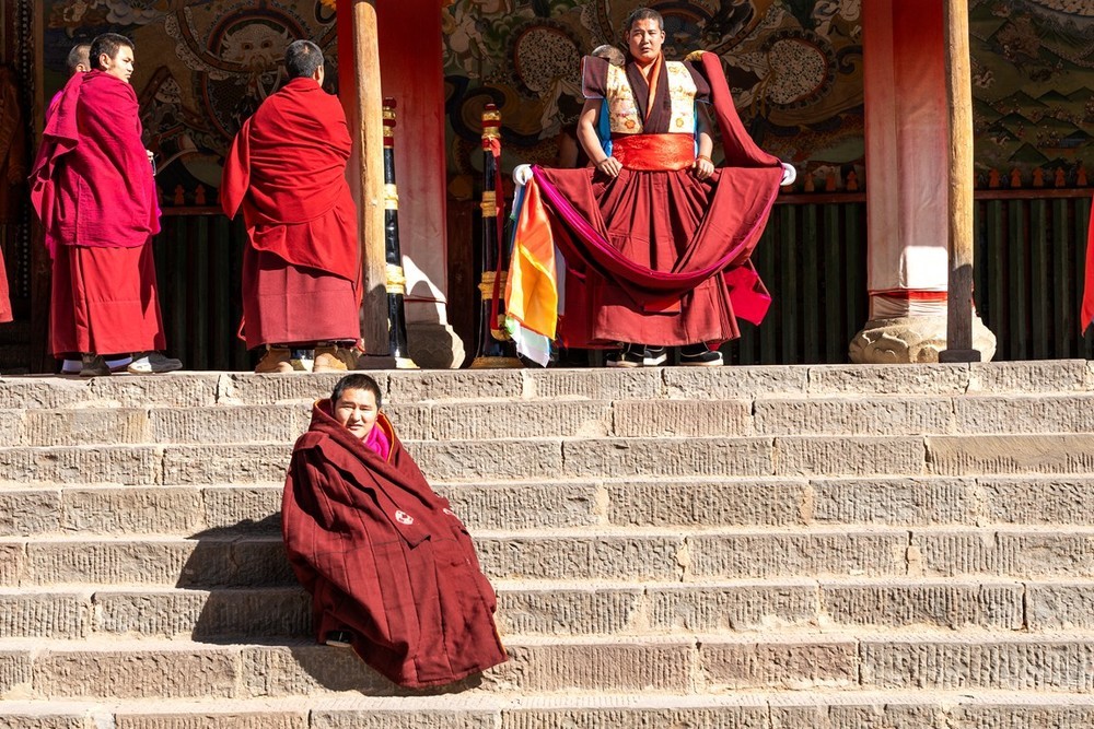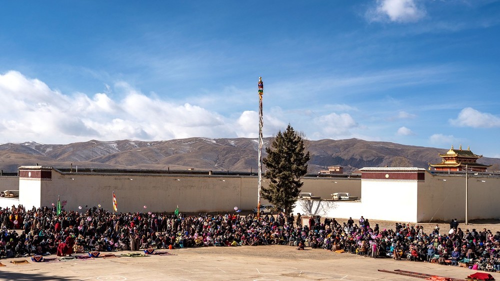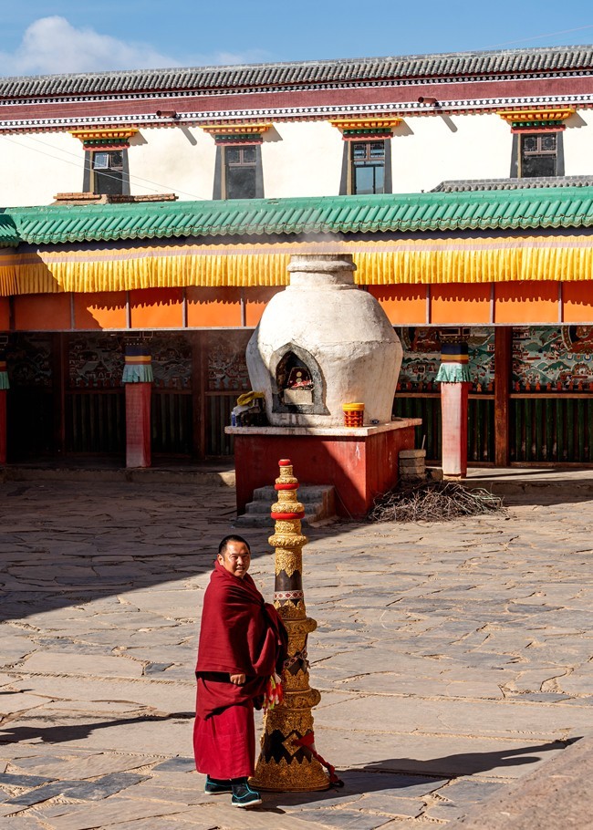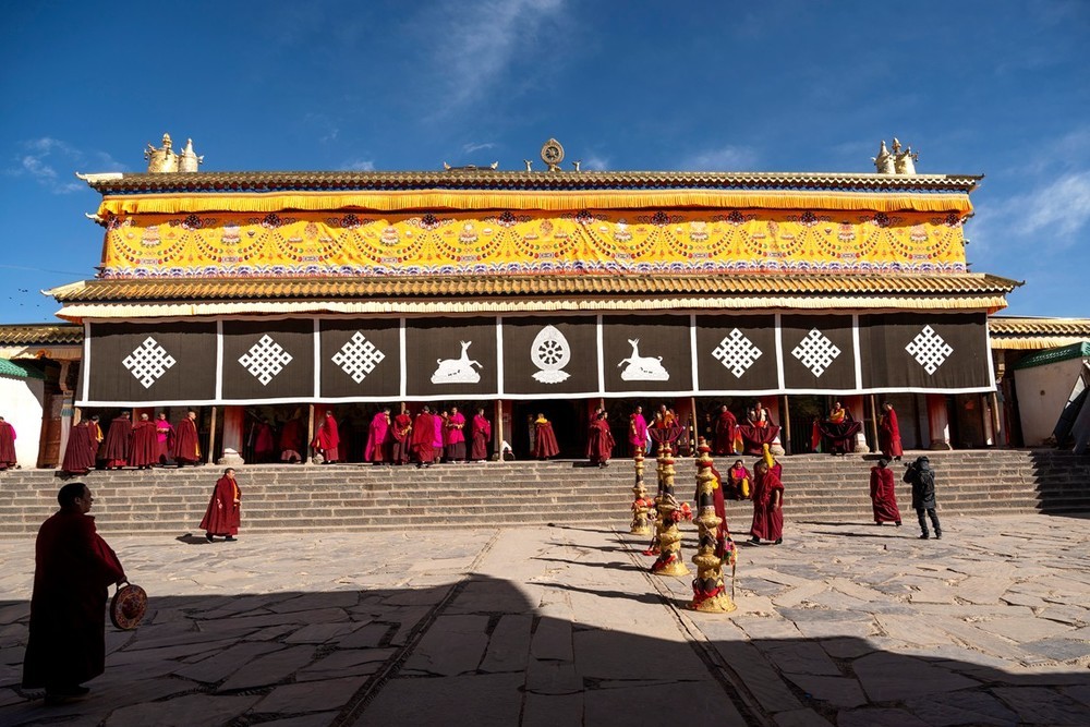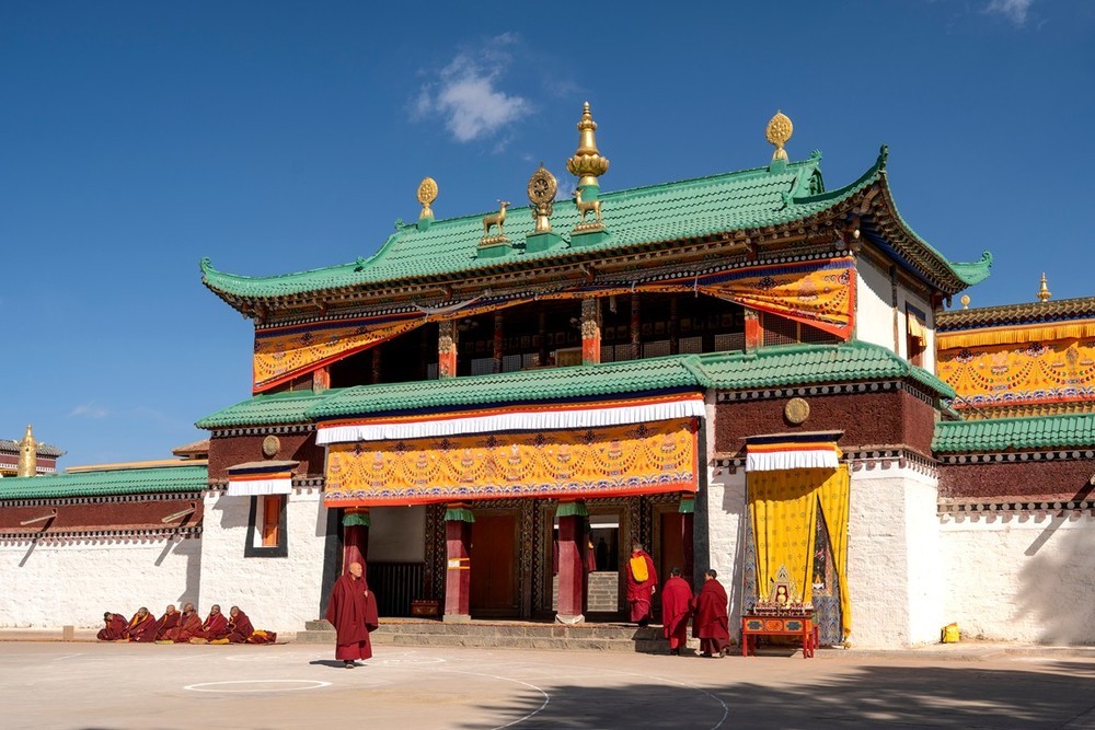 各莫寺又称为 “慧园寺”,位于四川省阿坝州阿坝县城各莫乡,是四川省阿坝州藏传佛教三大格鲁派寺院之一。各莫寺占地面积为 18000 平方米,主要建筑有菩提大宝塔、经廊、转经殿、大经堂、法喜苑等。其中,法喜苑荣获 “最大连体佛殿建筑” 与 “室内最高弥勒佛坐像” 中国大世界基尼斯之最,其主体为高 80 余米的弥勒殿,内有一尊 37 米高的鎏金弥勒佛坐像。菩提大宝塔共七层,塔高 35 米,塔座四周环绕着 140 只黄铜皮转经轮,塔内供奉着宗喀巴大师画像、缘悲经及各种陶土烧制的佛像 3 亿尊等。在看到各莫寺的建筑时,都会被其宏大的规模和精美的工艺所震撼。无论是高耸的法喜苑,还是金碧辉煌的菩提大宝塔,金顶在阳光下熠熠生辉,雕梁画栋,每一处细节都彰显着匠人的精湛技艺。殿前矗立着非洲楠木柱和印度大理石柱,与檀木原柱并立,材质珍贵,诠释 “万材归宗” 的宗教哲思。