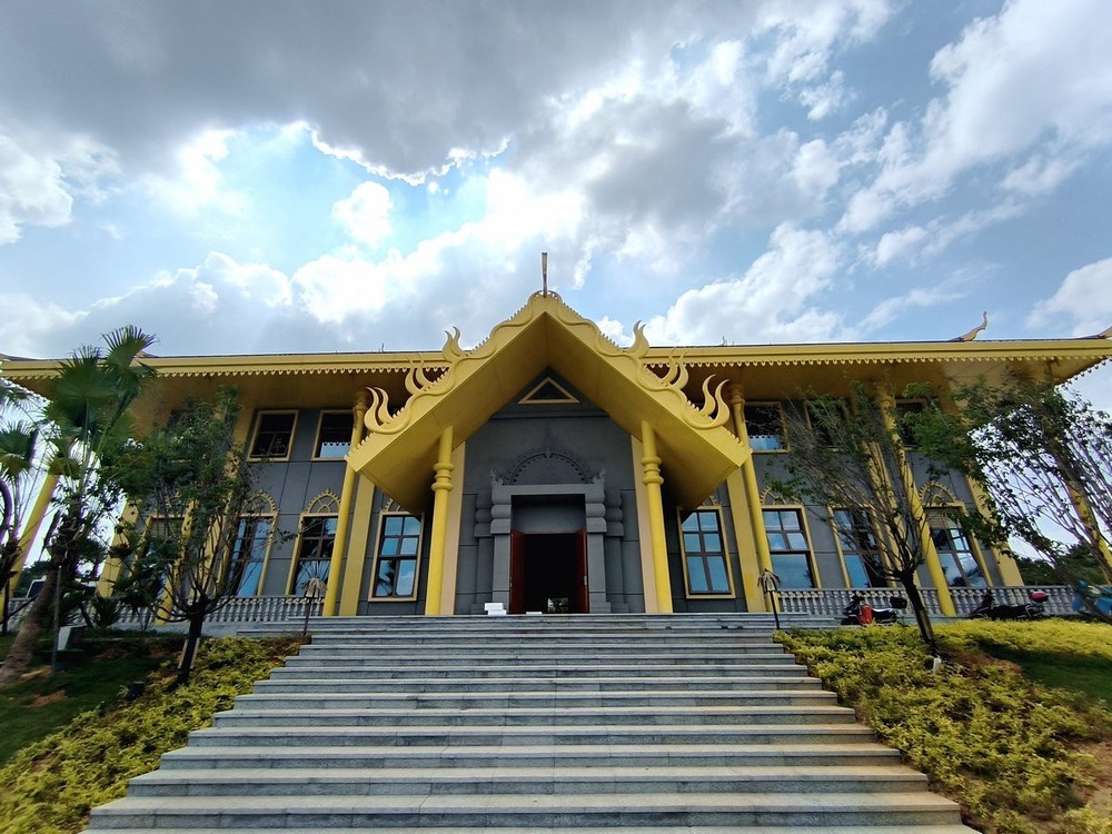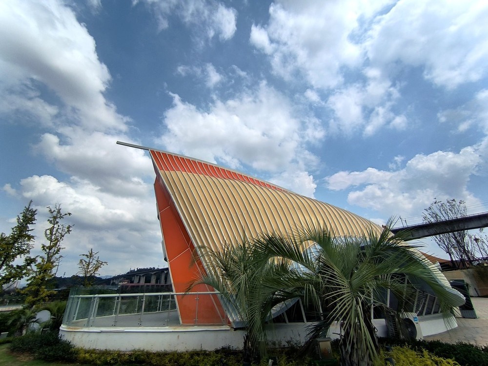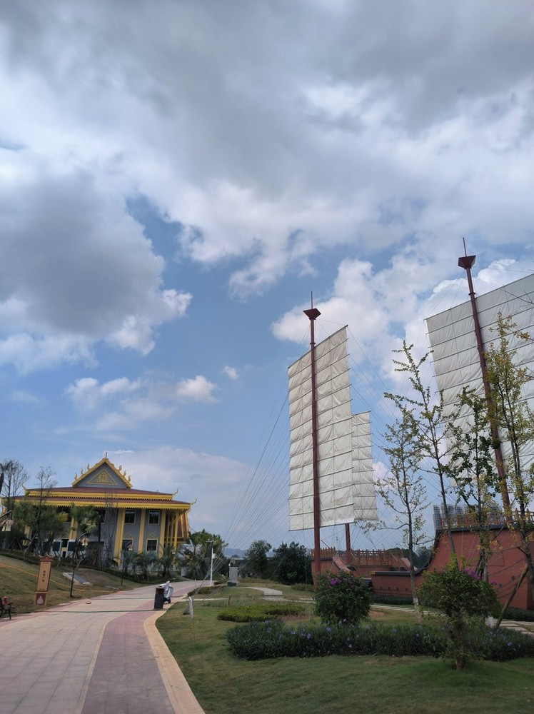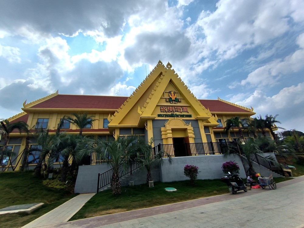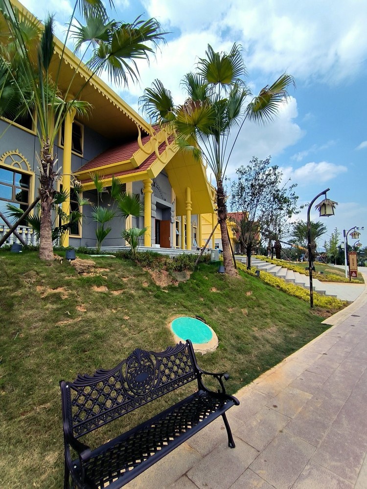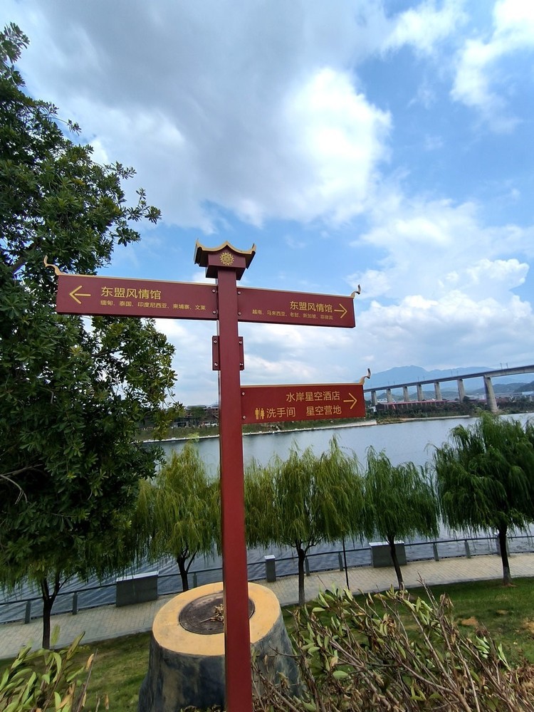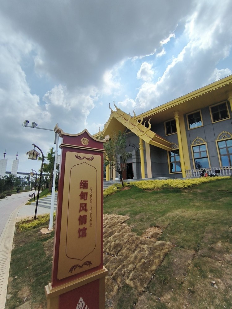 怀化东盟风情馆建筑风格鲜明呈现东南亚特色:鎏金屋顶与棕榈树交织成景,泰国风情馆的标识细节蕴含异域文化元素。白昼时分,造型别致的屋顶在蓝天映衬下勾勒出热带风情画卷;入夜后,霓虹灯光勾勒建筑轮廓,结合陆港大桥的光影秀,营造出流光溢彩的沉浸式氛围。。。