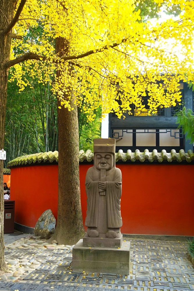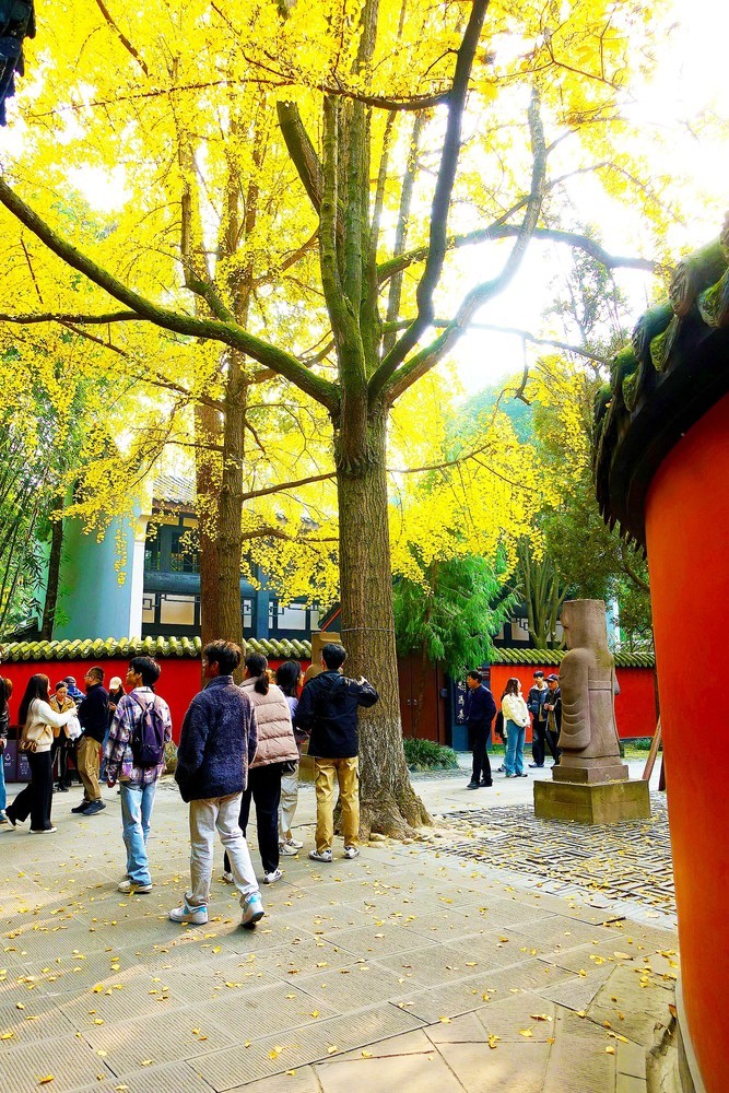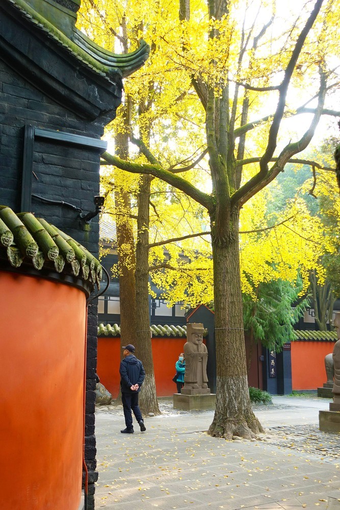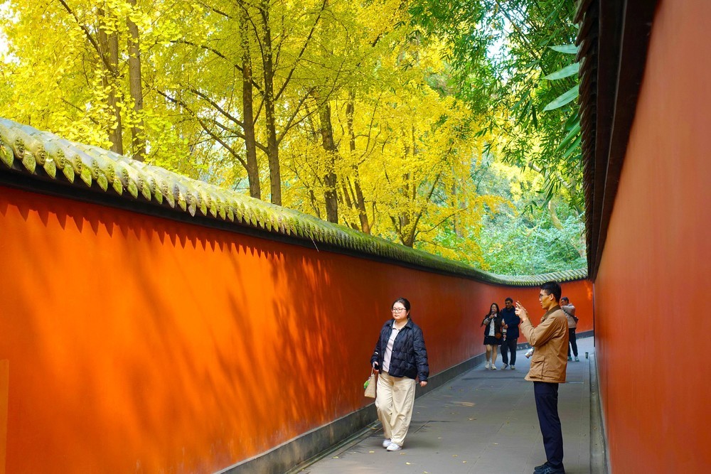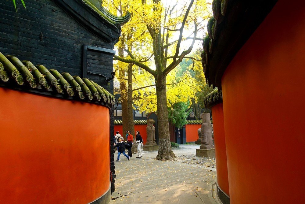 武侯祠博物馆的银杏与红墙晒朝夕,岁月伴随历史写春夏秋冬。