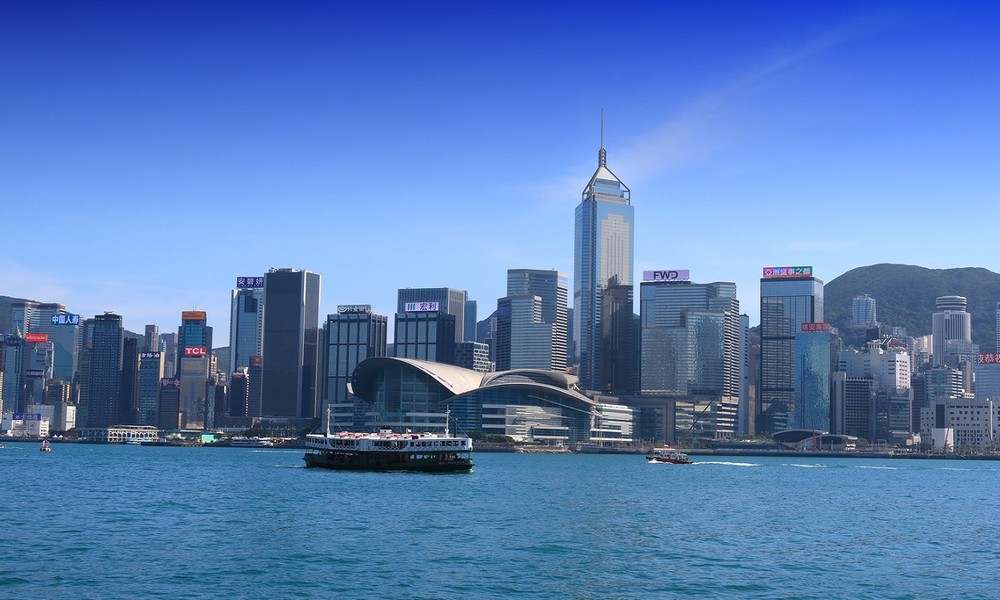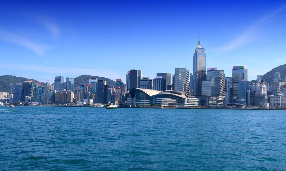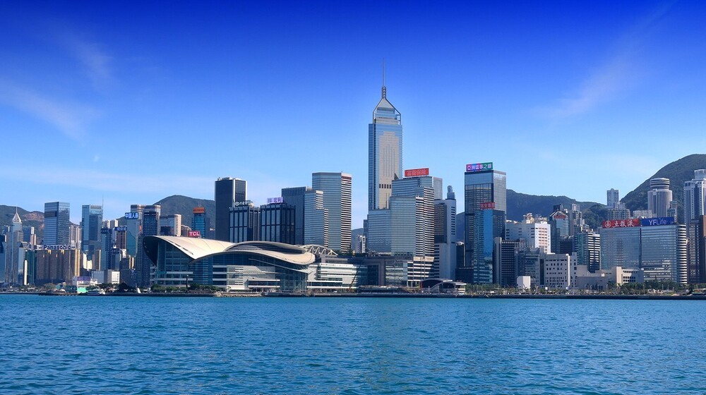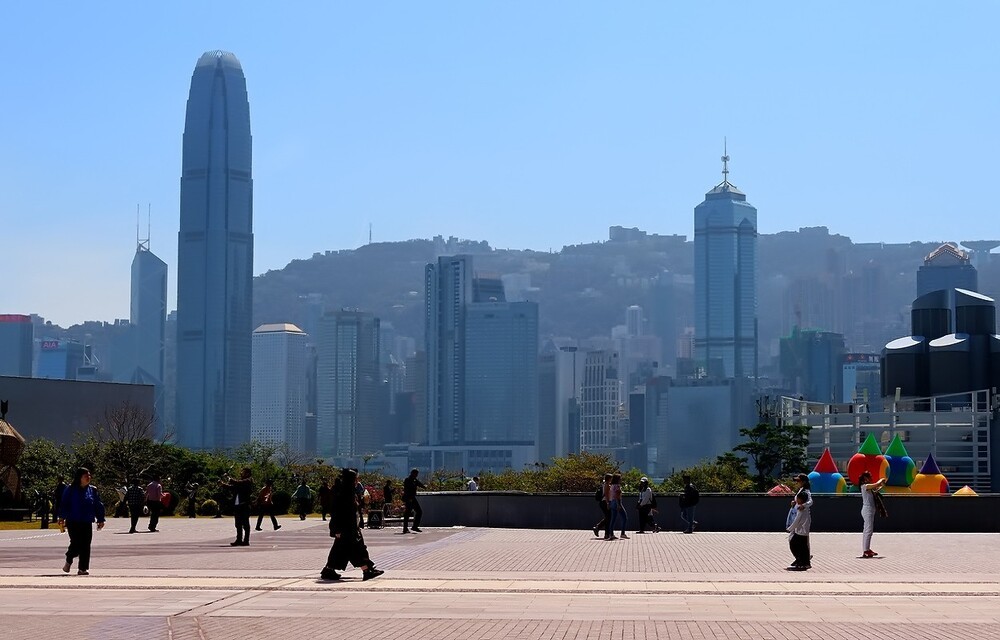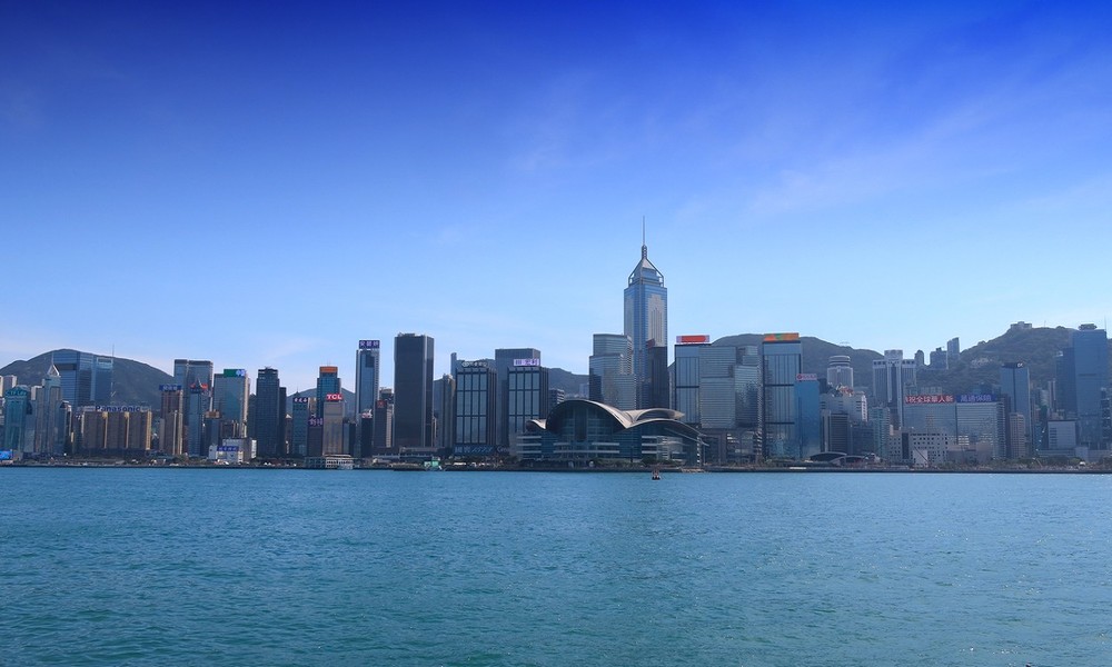 照片拍摄于香港维xxx港,视角是从九龙半岛(尖沙咀海滨)望向香港岛北岸。画面中最醒目的建筑是香港会议展览中心(会展中心),它独特的波浪形屋顶是香港的标志性建筑之一。会展中心后方的高楼群,包括中银大厦、长江集团中心等,共同构成了香港岛的核心天际线。