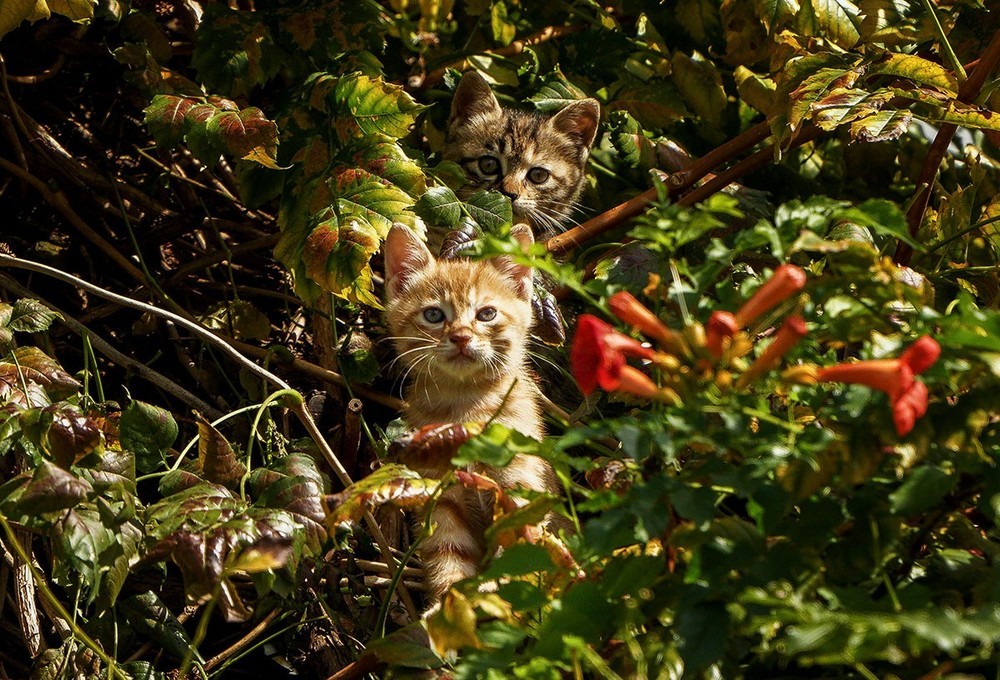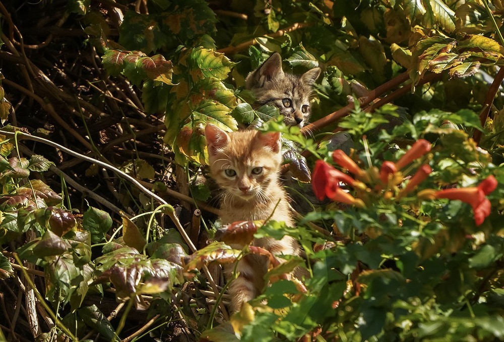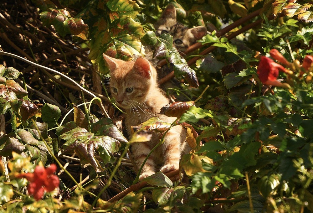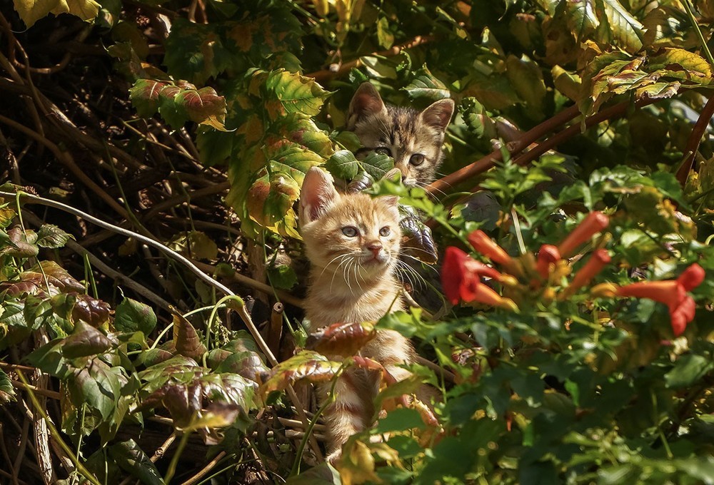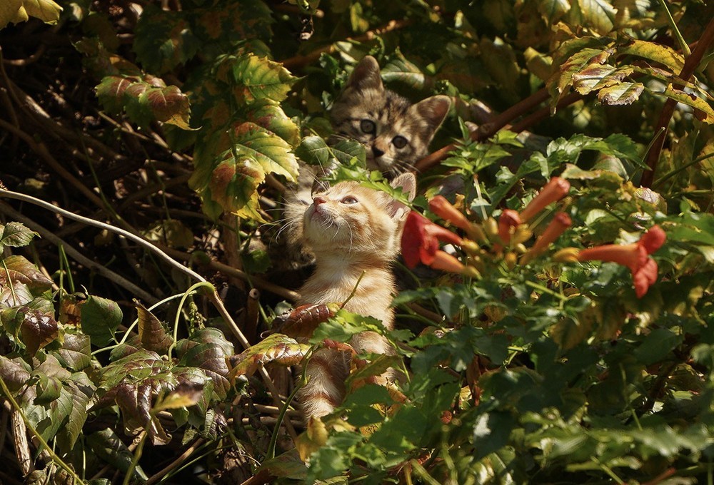 《1》公园里一处假山上有一族高出地面约20米的凌霄花,藤蔓茂密交织呈网状,其中有一窝小猫咪(3只)大约满月了,时不时的探出头来看看外面的世界......。
