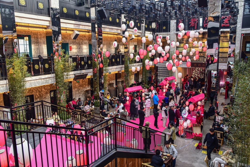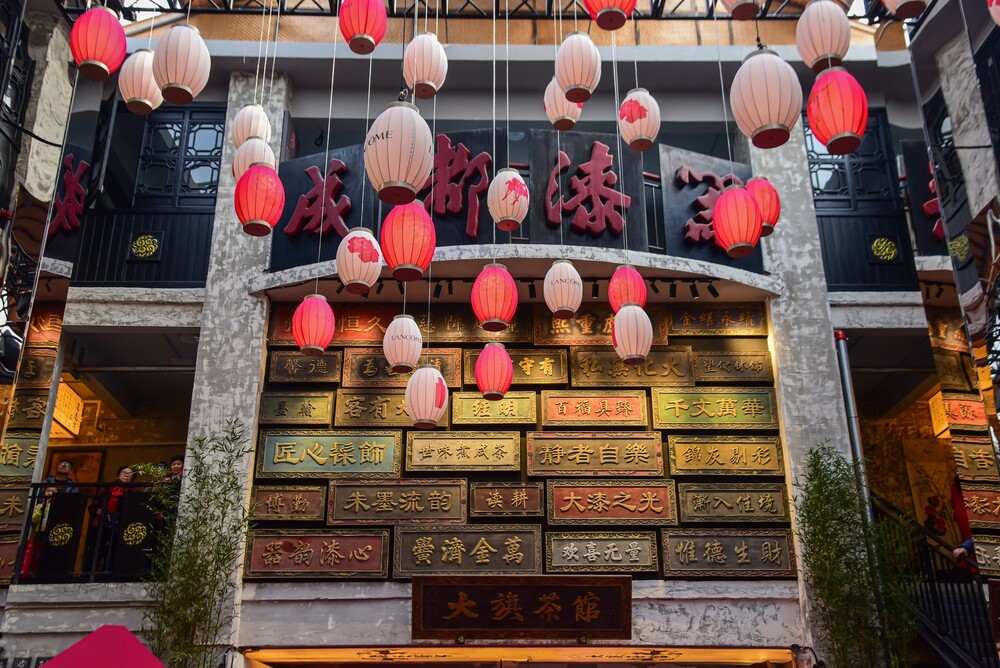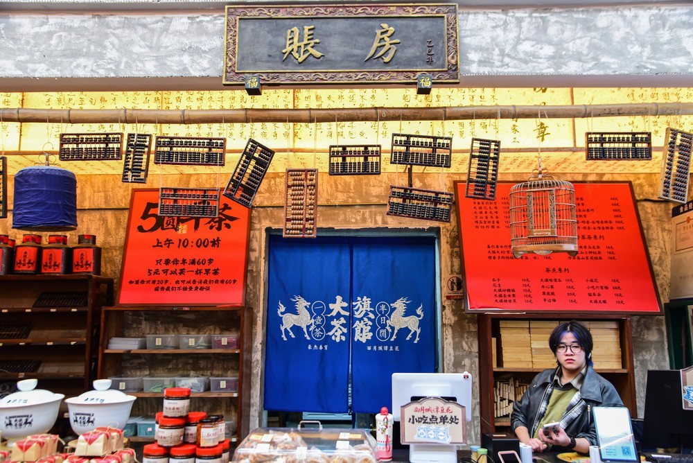 由原成都漆器厂旧址改造而成的大旗茶馆,巧妙地将老厂房的工业骨架与竹椅、盖碗茶、露天庭院等川式休闲元素相融合,辅以传统名小食和非遗文化展示,既保留了旧时光的印记,又注入了现代审美活力。