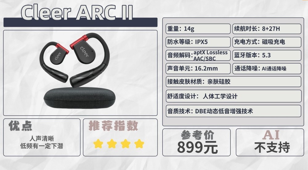 整个机型设计结合反Z型与C型桥结构,TPU高弹材质触感舒适。约5克的单耳重量极为轻盈,佩戴稳固且近乎无感。音质方面主打定向传音,人声清晰度尚可,但整体音质单薄,低频几乎无存在感,音乐聆听体验较为平淡。支持蓝牙5.4,连接稳定。双麦通话降噪应对安静环境足够。续航为单次5.5小时,综合19.5小时,并具备IPX5级防水。