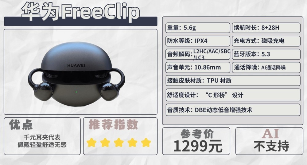 整体来看,华为FreeClip是一款设计极具巧思的耳夹式耳机,其佩戴舒适度和生态联动体验是其核心优势,非常适合华为手机用户作为日常辅助耳机,用于通话和资讯收听。但其在音质表现上的局限性也显而易见。