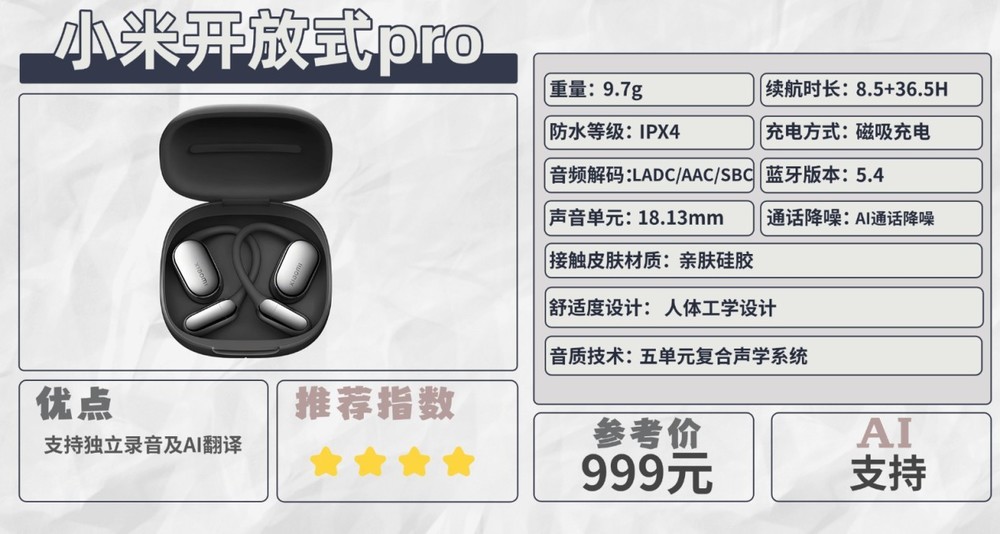 科纳皮质感材质搭配9.7克单耳重量,在保证触感的同时有效控制佩戴负担。耳机支持录音,关盒可支持中英文互译,总的来说,它把核心成本和技术都投入在了音质、续航和基础体验 上。在 AI和防漏音这两个细分赛道上,它选择了够用就好的策略,以确保在999元的价格上提供最具竞争力的核心性能。