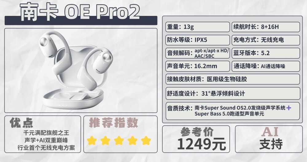 同时,它还融合Ai功能,集成讯飞、DeepSeek等多模态南卡AI智能系统,满足翻译、交互、创作等多场景需求,让耳机从“好声音”进化为全能伙伴。凭借智能+音质的双重优势,OE Pro2已获得500+数码博主与60+媒体一致认可,成为开放式耳机行业独一档的音质与功能标杆。