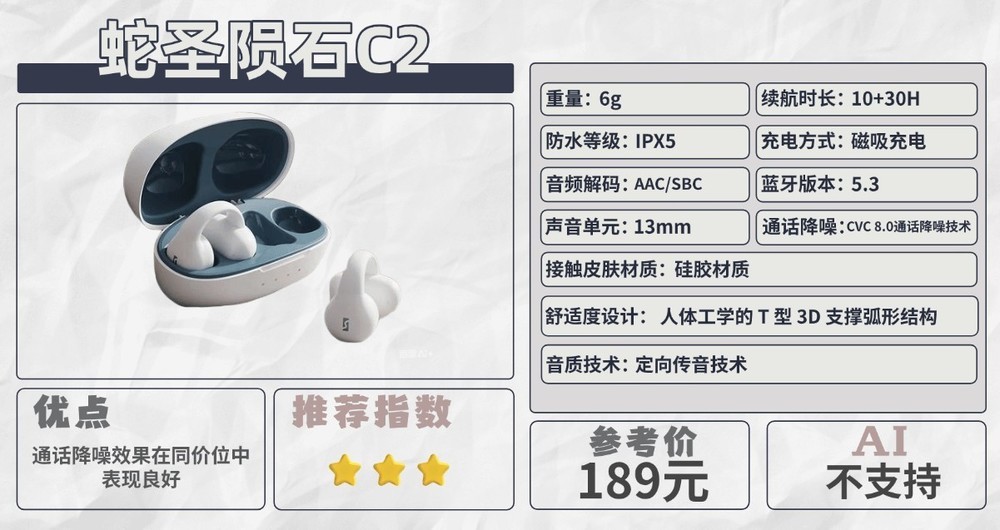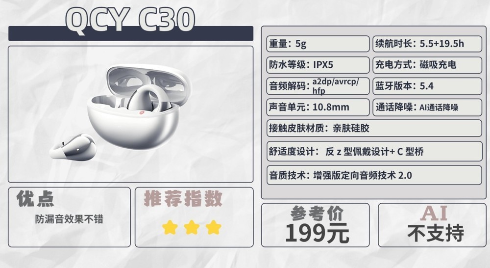 整体来看,QCY C30是一款极致轻量化的入门级耳夹耳机,其核心优势在于极致的佩戴轻便感和基础的听音功能,非常适合预算有限、对音质要求不高的用户。