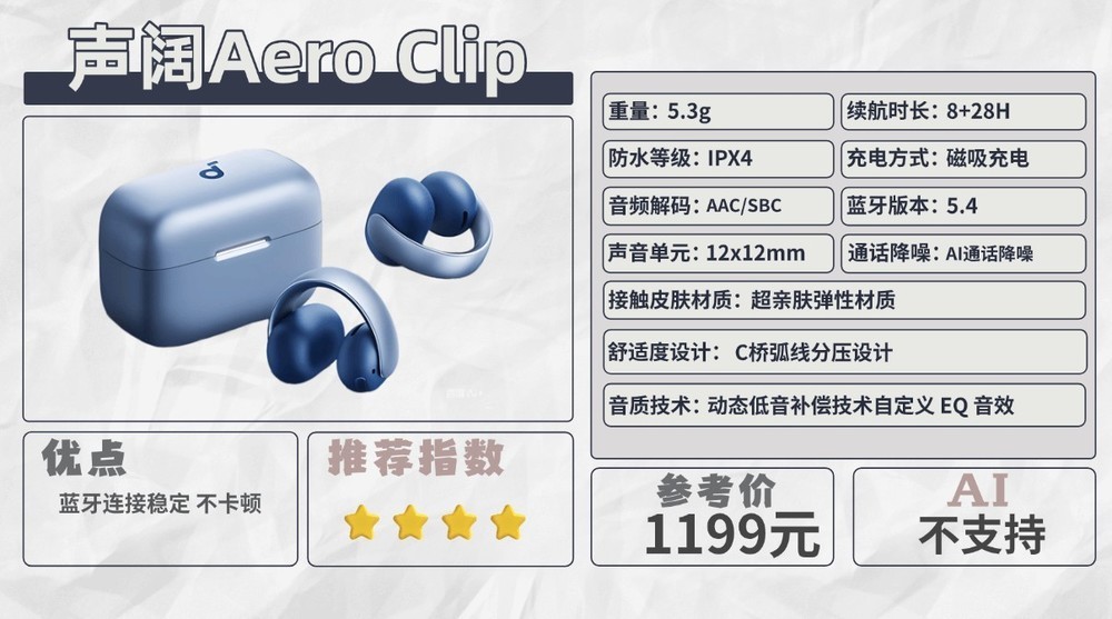 声阔AeroClip支持蓝牙5.4,连接稳定快速。其AI通话降噪技术能有效抑制环境噪音,保障通话清晰度。续航方面,单次8小时配合充电盒28小时的表现处于主流水平,满足日常使用需求。