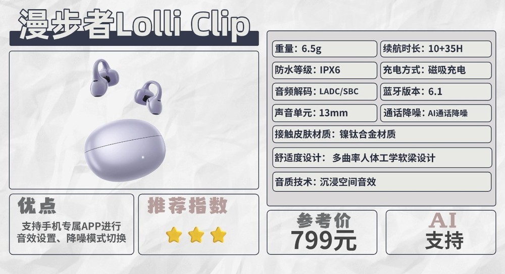 支持蓝牙6.1与LDAC高清音频,连接稳定性好,在适配机型上能提供卓越的无线音质体验,但与非适配设备连接的音质优势会打折扣。其AI通话降噪功能能有效提升通话清晰度。续航表现扎实,单次10小时,综合续航达35小时,并具备IPX6级防水。整体来看,漫步者Lolli Clip是一款在连接技术和中高频音质解析上有突出表现的耳夹式耳机,尤其适合追求高清音频细节、且需要长续航与可靠防护的用户。其在低频表现和音质适配门槛方面的局限,也值得潜在用户注意。