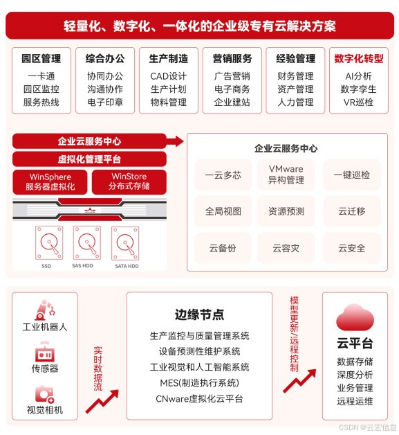 针对MES、APS、WMS等系统割裂导致的流程阻塞,利用WinStack虚拟化云平台构建私有云平台,集成PLM、ERP、MES等核心生产系统。通过标准化接口与自动化工作流,实现生产计划、物料调度、质量管控的全链路协同。业务流程一键打通后,跨部门协作效率显著提升,订单交付周期缩短,生产灵活性增强。