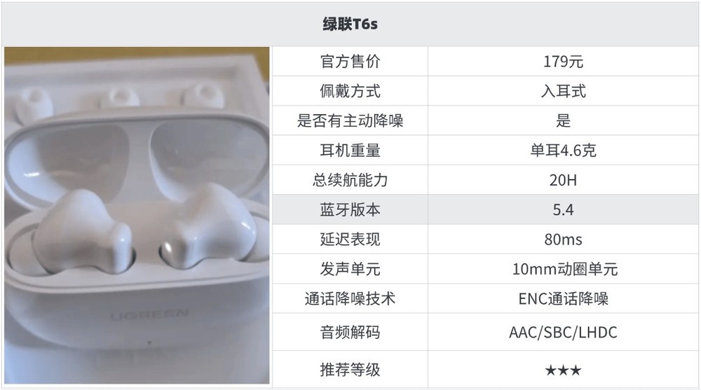 10大性价比超级高的蓝牙耳机推荐6、绿 联T 6s蓝牙耳机