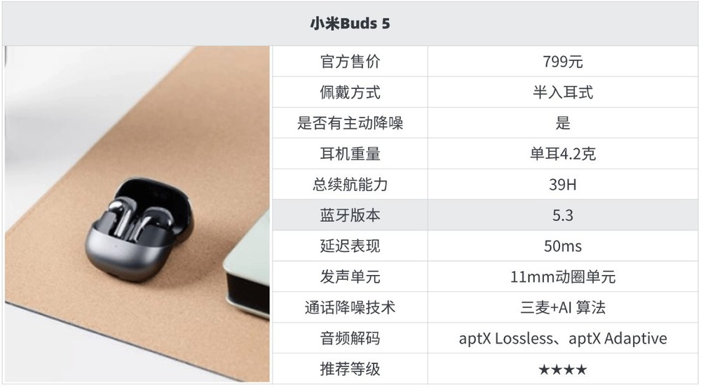 10大性价比超级高的蓝牙耳机推荐10、小米Buds 5 蓝牙耳机