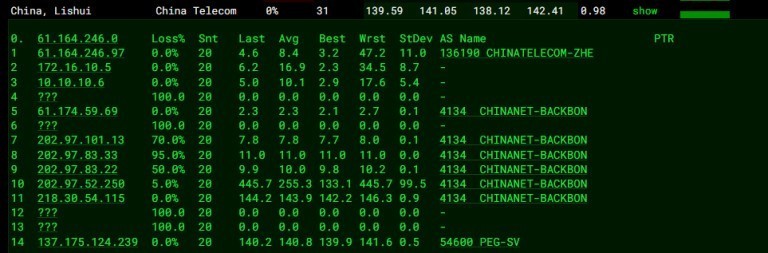 3.5 中国电信回程 MTR 测试 如下图