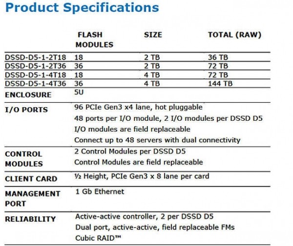 该款全闪存阵列DSSD不仅可交付千万的IOPS,而且最多支持36块闪存驱动器(模块),拥有144TB存储容量。支持双端口客户端卡、双H/A控制器、冗余组件等功能,提升了其作为企业产品的可用性和稳定性。
