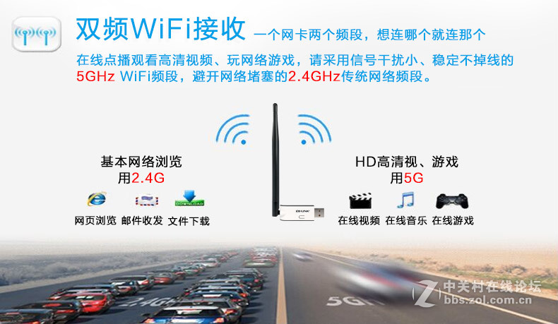 一个网卡两个频段,想连哪个就连哪个,全新的WiFi技术—802.11AC,传输速率是普通网卡的3倍,并且支持5G无线信号,以更快的无线吞吐量进行数量传输,802.11AC向下兼容802.11a/n/b/g;支持2.4G和5G双频段。
