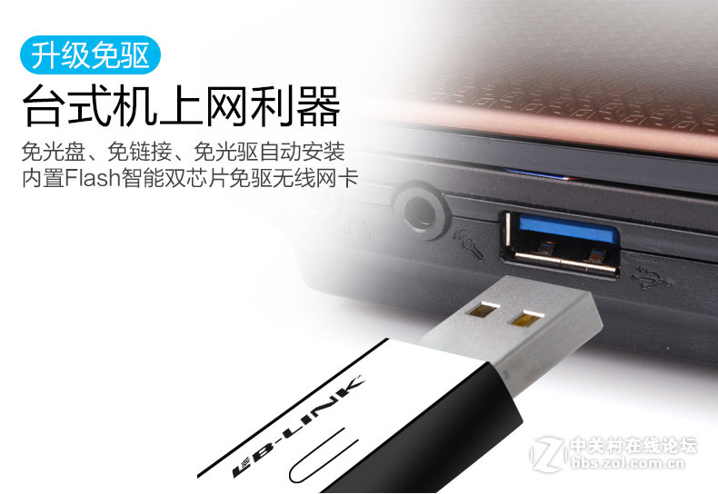 台式机上网利器,免光盘、免链接、免光驱自动安装,内置FLASH智能双芯片免驱无线网卡。