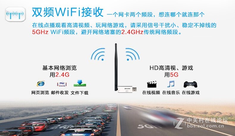 支持接收2.4G和5.0GHz两个频段的WiFi信号,用户根据网络环境及终端设备自由选择工作频段,避开无线干扰,5dbi高增益天线无线伸展,信号接收强,在线看视频、听音乐、玩游戏带给您不一样的网络体验!