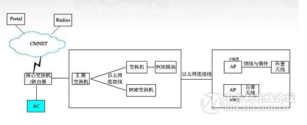 AC控制器相当于一个网关,在整个组网结构中处于上游,如图所示,AC100可以放在核心交换机和汇聚交换机之间,而不是很多人认为的直接连接无线AP。