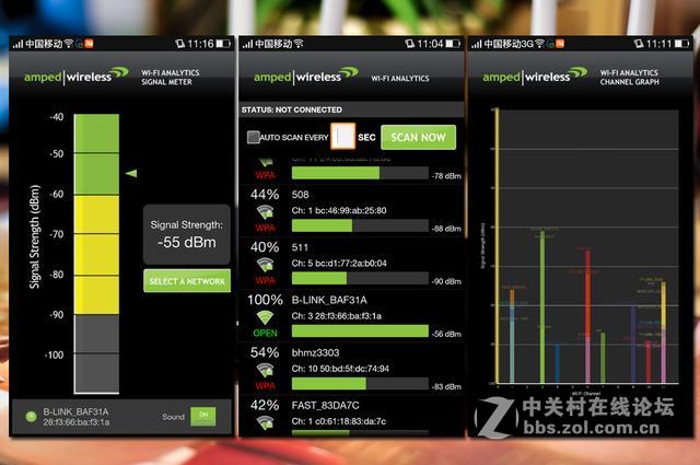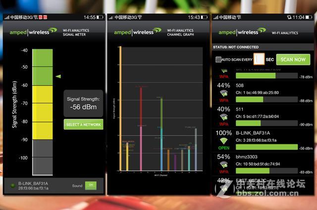 隔了一堵墙的D点,信号强度数值-55dBm,右侧图红柱为另外一款路由器,穿墙后信号强度上必联明显占优势。