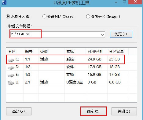 2、弹出u深度pe装机工具,点击浏览按钮选择ghost win8镜像,并选择c盘做为系统盘,点击确定,如下图所示: