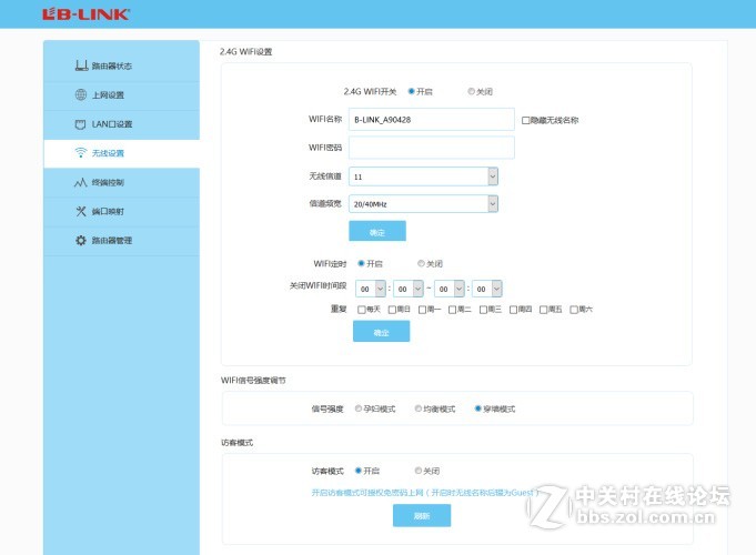 2、无线密码设置 :无线设置就是设置无线wifi网络,开启wifi开关输入英文wifi名词以及密码并确认无误,也可以选择旁边的隐藏无线名称防止搜索,我们可以根据环境选择信号强度,还能设置访客免密码上网以及随时调整wifi开放时间。