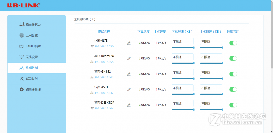 3、终端上网控制设置:终端控制就是对所有连接到路由器的设备进行管理能够设置它们的网速。