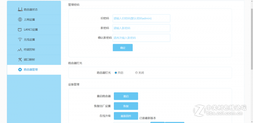 4、路由器管理设置:这里是路由器管理界面,能够修改路由器管理密码、关闭开启路由器指示灯(这样就不会因为灯光闪烁影响夜间休息)、还能重启升级路由器和恢复出厂设置。