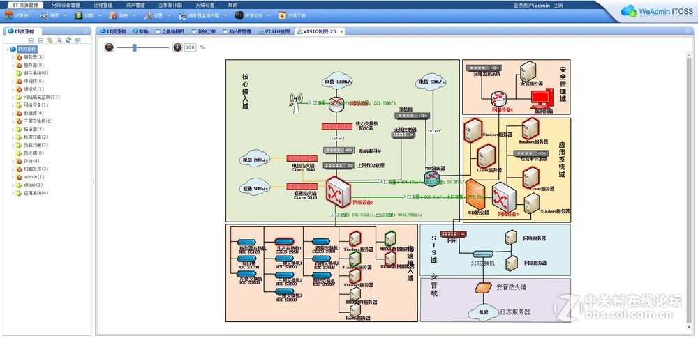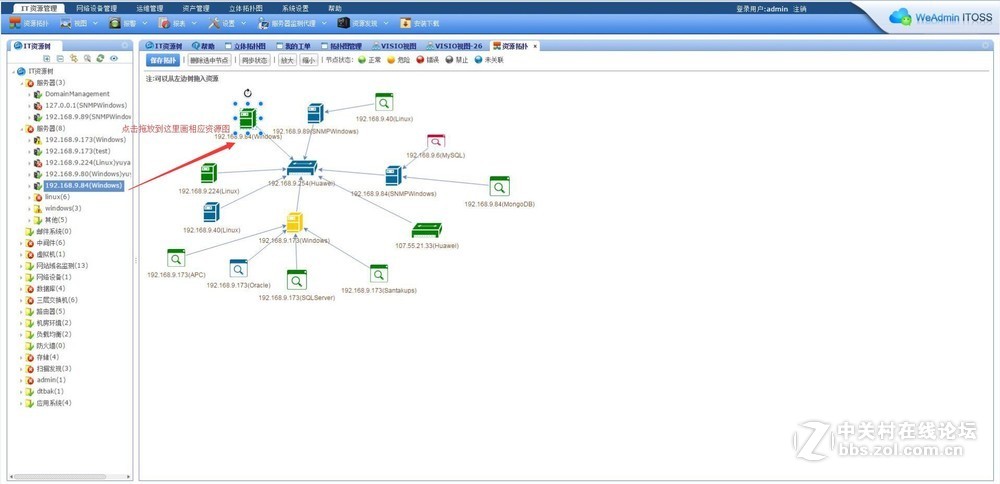 4、资源拓扑,这种拓扑图与IT资源树也就是监测的设备服务器一体集成,把这些设备资源拖放到编图区域可以画各种动态的拓扑图,与VISIO不同的是,它的监测信息数据好像自身已经从监测中关联开来,好像还可以做几张图保存,这个做起来我觉得还是很方便的。