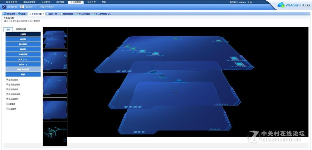 3、立体拓扑图,这种拓扑图是添加资源节点后,自动形成的网络层、服务器层、应用层的三层立体拓扑图,很酷很炫很形象,这个技术个人还没有琢磨想明白,比较高深吧,