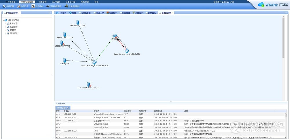 相比较而言,这四种图似乎各有特点,想问有没有一种拓扑图能囊括这个所有功能的画法与用法,像我们公司有几百个网络设备,几十台服务器,多个分支持网络,就这几个拓扑图来说,那一个比较实用,不知道有朋友用过免费网管软件的东西,有什么好的经验提示一下,用在什么地方比较有意义和有效果,另外说一下本人还在初用WeADMIN轻松网管,也是永久免费,公司要求把网络与设备监控起来,有没有这行的朋友用过的,顺便问一下,还没有比这个功能更强在的免费开源的软件吗?